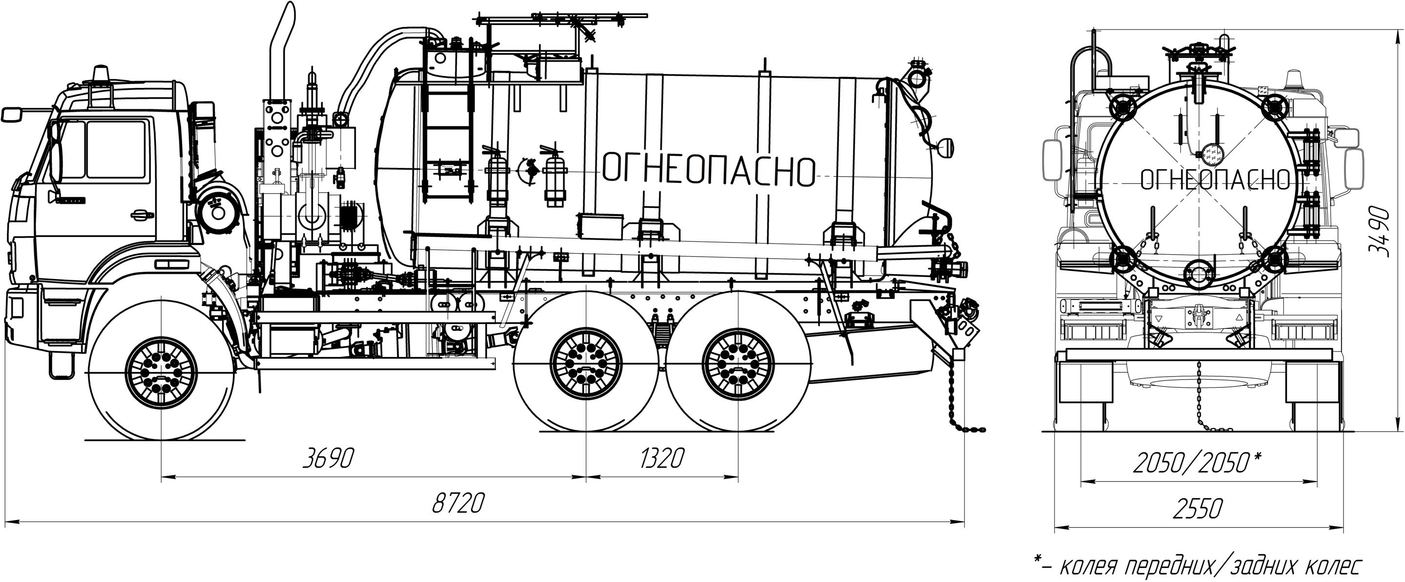 Камаз 43118 без спального места, объем емости 10 куб.м., насос КО-505А или ВК-3М или ВК-6М2 или PNR122D, привод клиноременный, сечение цистерны круглое, ручное открывание днища, средства безопасности, доработка шасси под ЛВЖ.