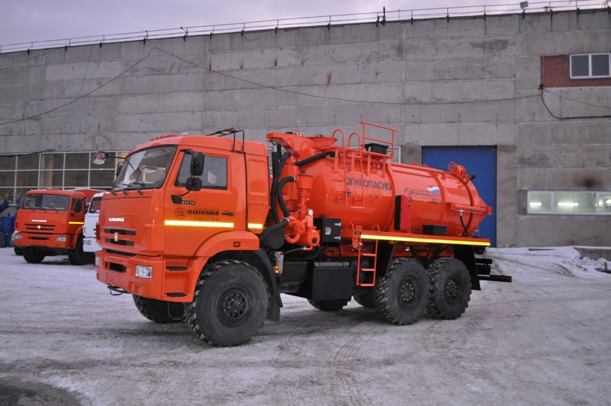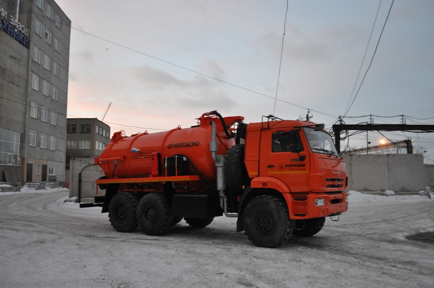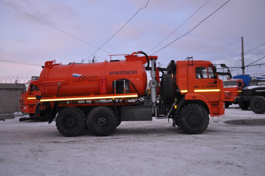 Камаз 43118 без спальным местом, объем емости 10 куб.м., насос КО-505А или ВК-3М или ВК-6М2 или PNR122D, привод шкивоременный, сечение цистерны круглое, гидравлический подъем цистерны, гидравлическое открывание днища, средства безопасности, доработка шасси под ЛВЖ.