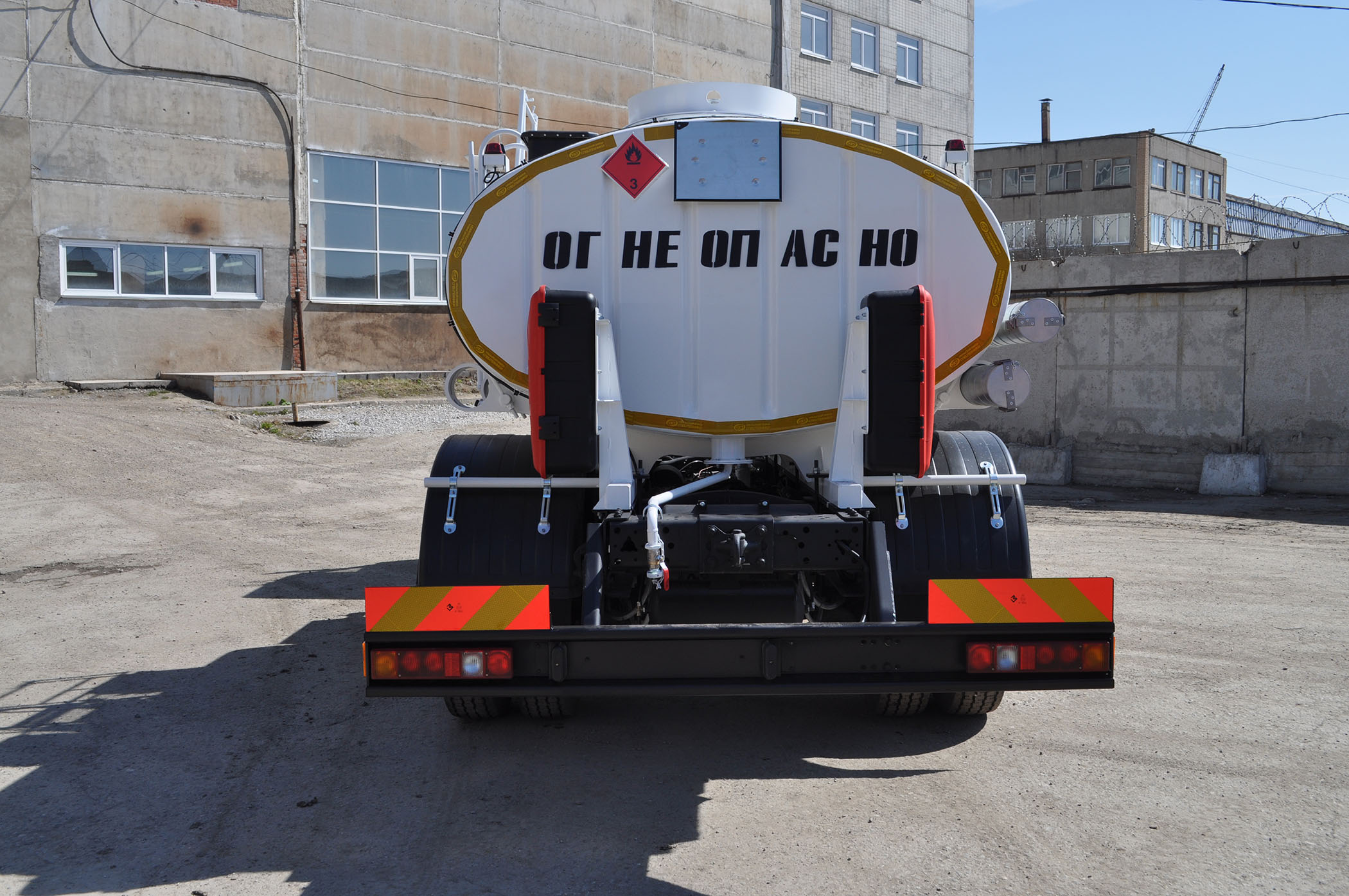 перенос глушителя выхлопа шасси; искрогаситель - 1 шт. (сертифицированный); защита топливных баков; экранирование электропроводки; проблесковый маячок - 2 шт. оранжевого цвета на кронштейнах; устройства заземления (ЗУ-1.021 - 1 шт., цепь заземления на отбойнике - 1 шт.); огнетушитель - 2 шт. ОП-6 в пластиковых пеналах; медицинская аптечка - 1 шт.; табличка оранжевого цвета с идентификационным номером опасности и номером ООН - 2 шт.; знак 3.17.2 "ОПАСНОСТЬ" с упором - 1 шт.; упор противооткатный - 2 шт. с кронштейнами; ящик для песка; ящик для кошмы; заднее защитное устройство - отбойник; информационные таблички - 2 шт. |