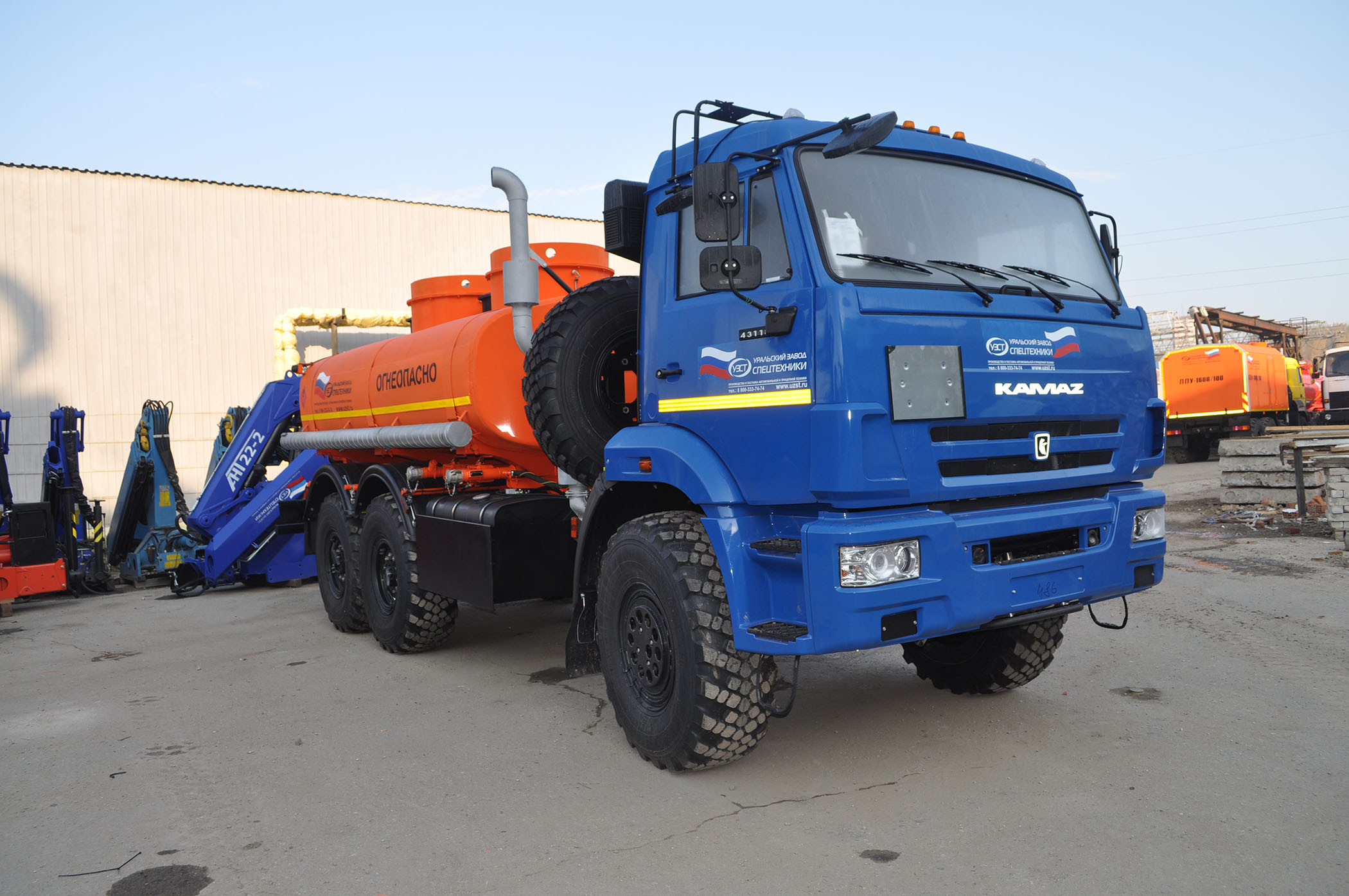 Камаз 43118-3049-46 со спальным местом, объем емкости 9 куб.м. 1 секция, насос СВН-80, привод карданный, сечение цистерны чемоданное или элипсное, средства безопасности, доработка шасси под ЛВЖ.