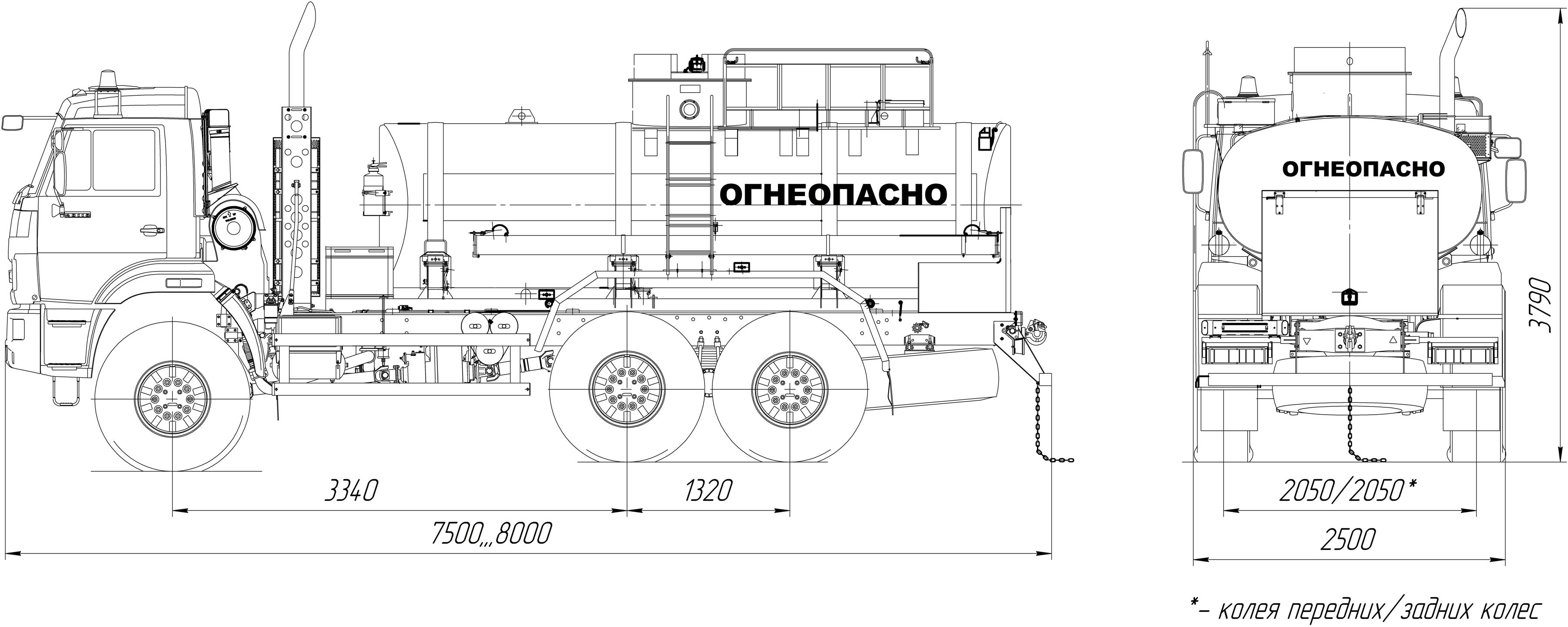 Камаз 5350-3912-42 без спального места, объем емкости 7,5 куб.м. 2 секции, насос СВН-80, привод карданный, сечение цистерны чемоданное или элипсное, средства безопасности, доработка шасси под ЛВЖ.