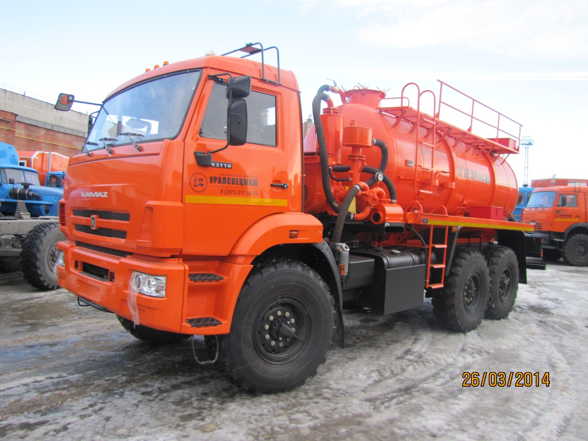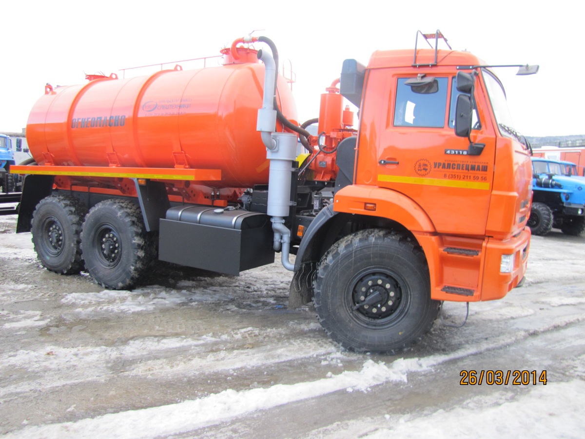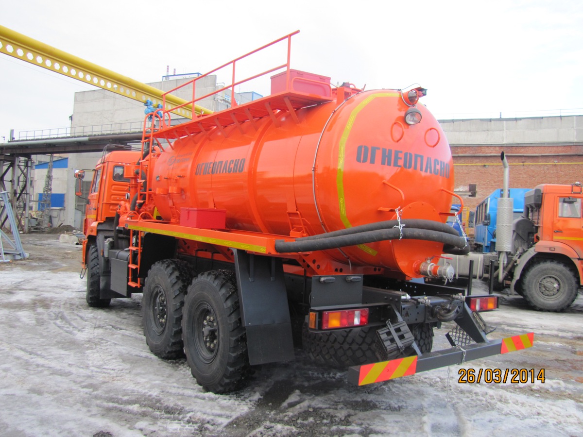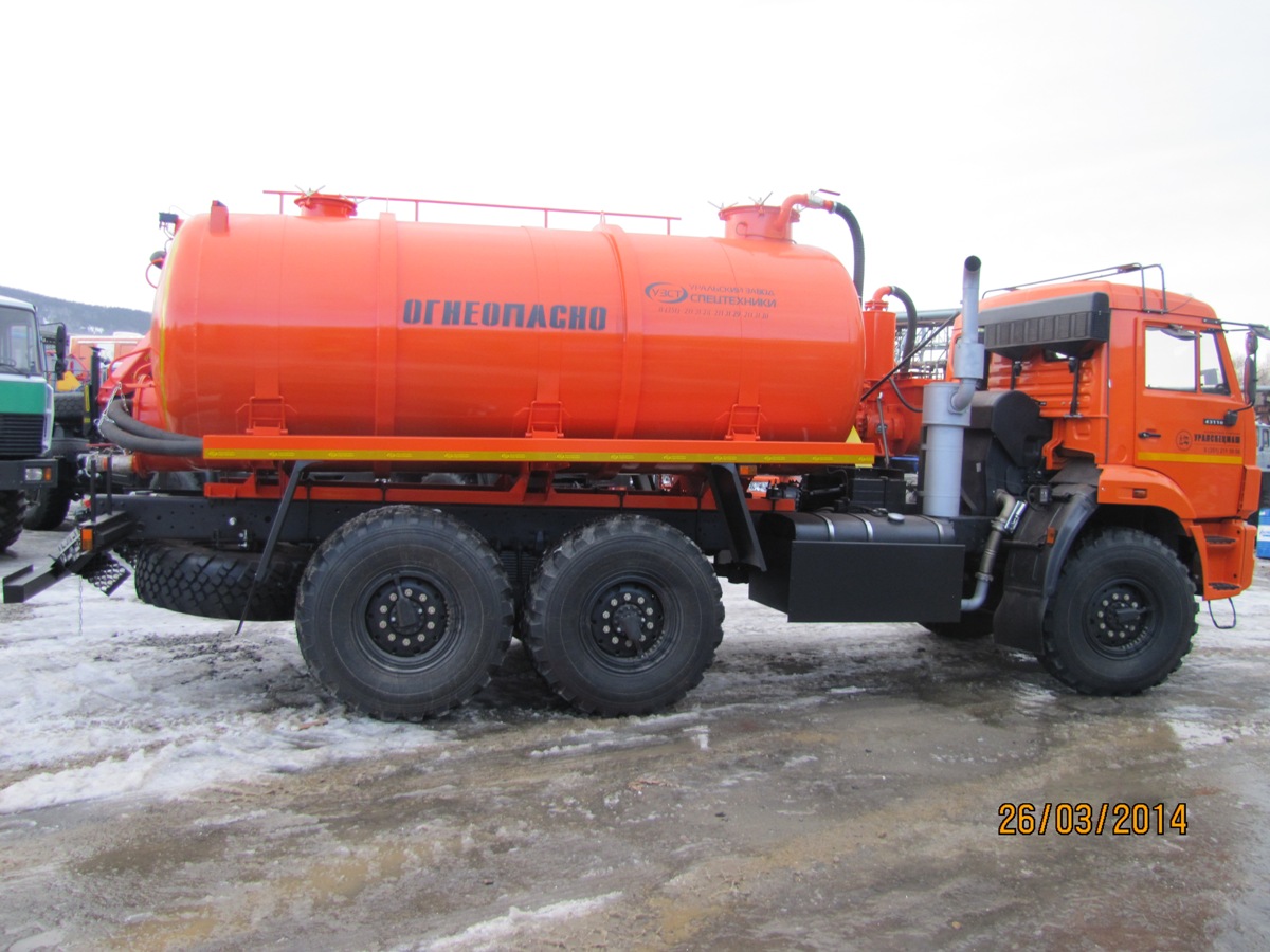 Камаз 43118 без спального места, объем емости 10 куб.м., насос КО-505А или ВК-3М или ВК-6М2 или PNR122D, привод карданный или шкивоременный или клиноременный, сечение цистерны круглое, средства безопасности, доработка шасси под ЛВЖ.