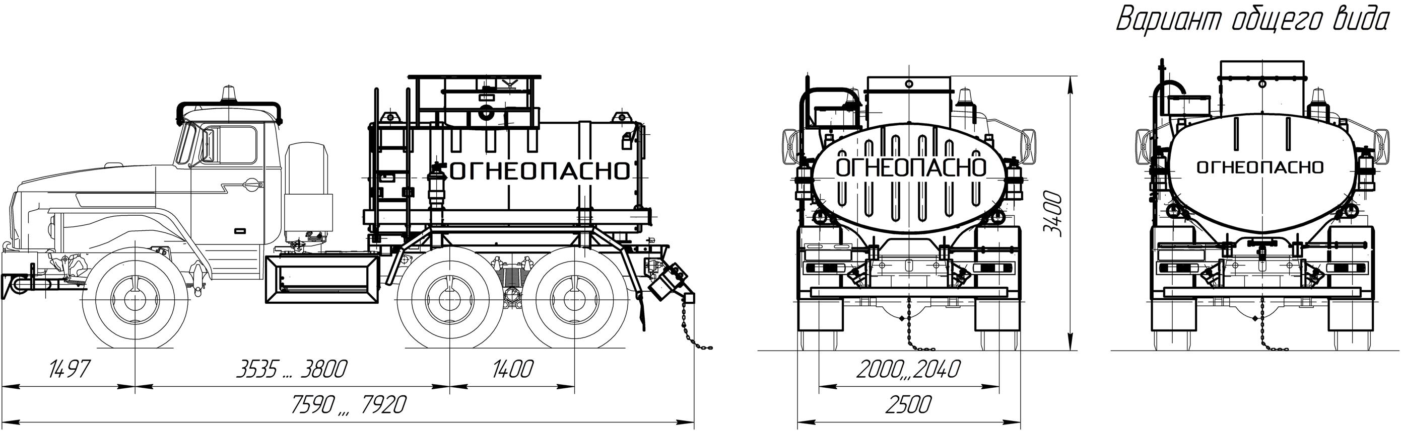 УРАЛ-4320-1151-61 (71) без спального места, объем емости 6,5 куб.м., насос СВН-80, привод карданный, сечение цистерны чемоданное или элипсное, средства безопасности, доработка шасси под ЛВЖ.