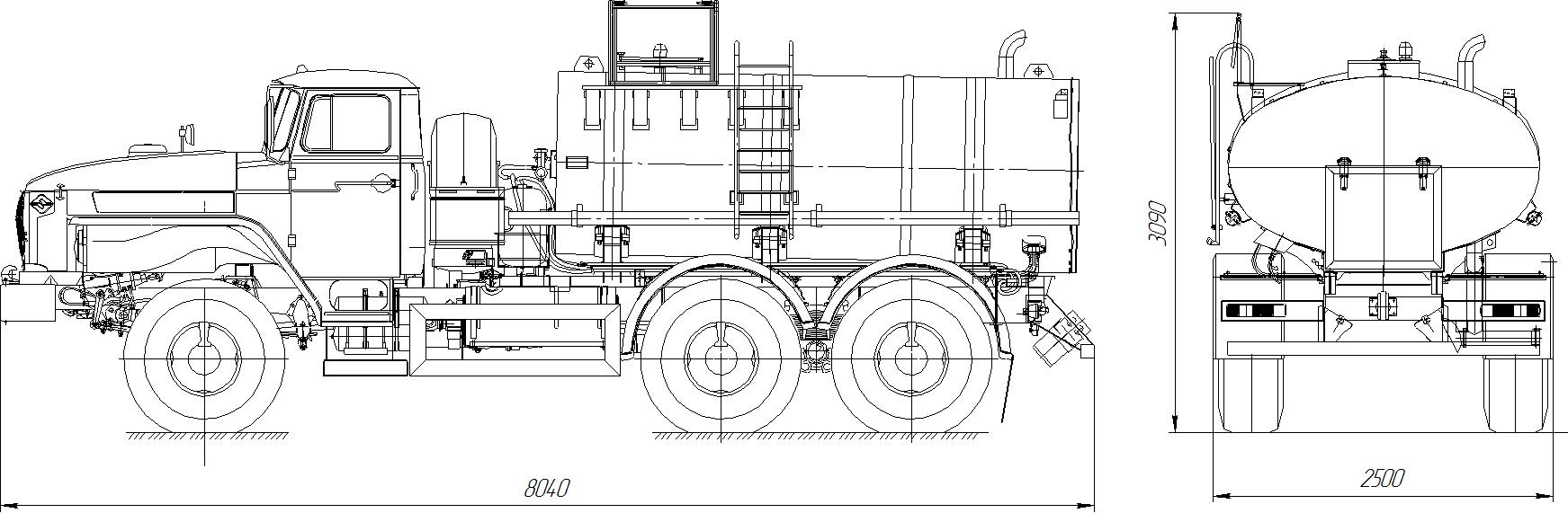 УРАЛ 4320-1112-61М без спального места, объем емкости 6,5 куб.м., внутрення оболочка из пищевой нержавеющей стали 2 мм марки AISI 304, утеплитель смола ФРВ-1А с отвердителем ВАГ-3, наружняя оболочка из стали 1,5 мм марки СТ08ПС, насос НШ-32, привод карданный или шкивоременный или клиноременный, гидромотор 310.2.2.28, сечение цистерны эллипсное или чемоданное, средства безопасности.