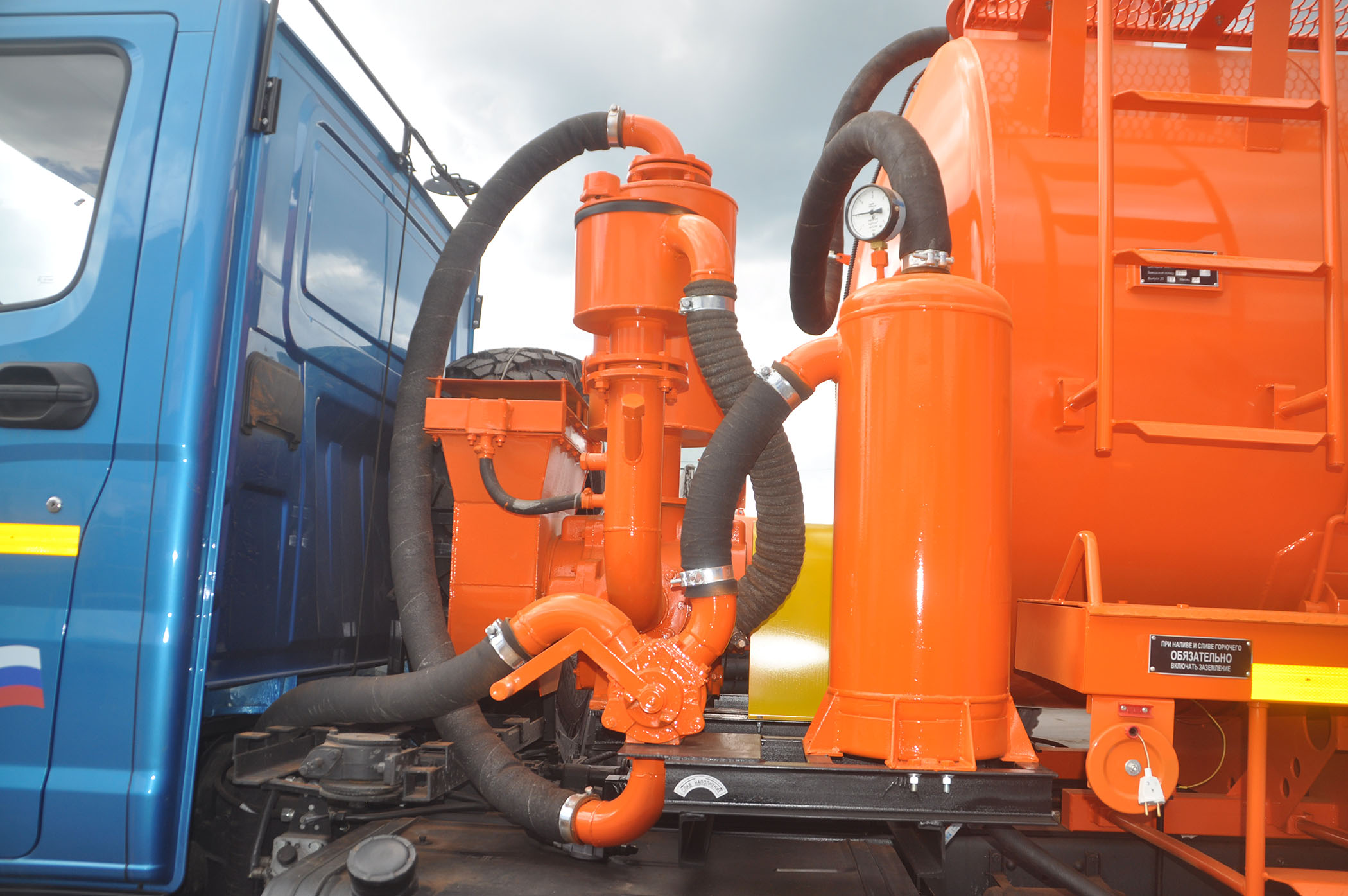 первый запорный клапан на горловине с шаром второй запорный клапан (вертик. ресивер с шаром) вакуумный клапан (-0,8 кг/см2), клапан избыточного давления (+0,4 кг/см2 ) атчик предельного заполнения MS DUG11-N-10 с отключением двигателя шасси смотровое окно сферической формы с подсветкой для визуального контроля наполнения |