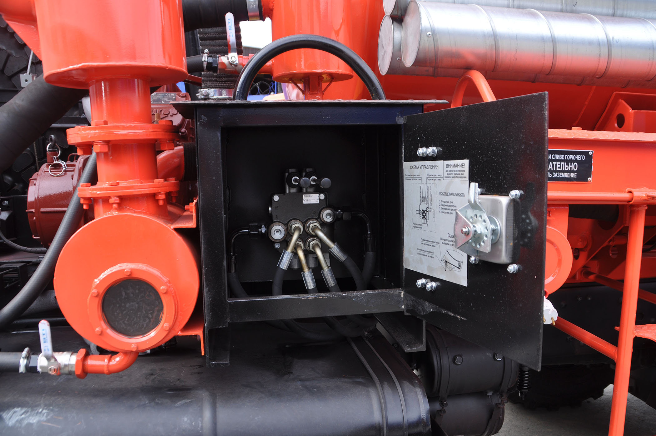 воздушный фильтр первый запорный клапан на горловине с шаром второй запорный клапан вакуумный клапан (-0,8 ати), клапан избыточного давления (+0,4 ати) температурный датчик насоса для отключения двигателя шасси со звуковой сигнализацией при превышении допустимой температуры нагрева датчик предельного заполнения с отключением двигателя шасси смотровое окно сферической формы с подсветкой для визуального контроля наполнения |