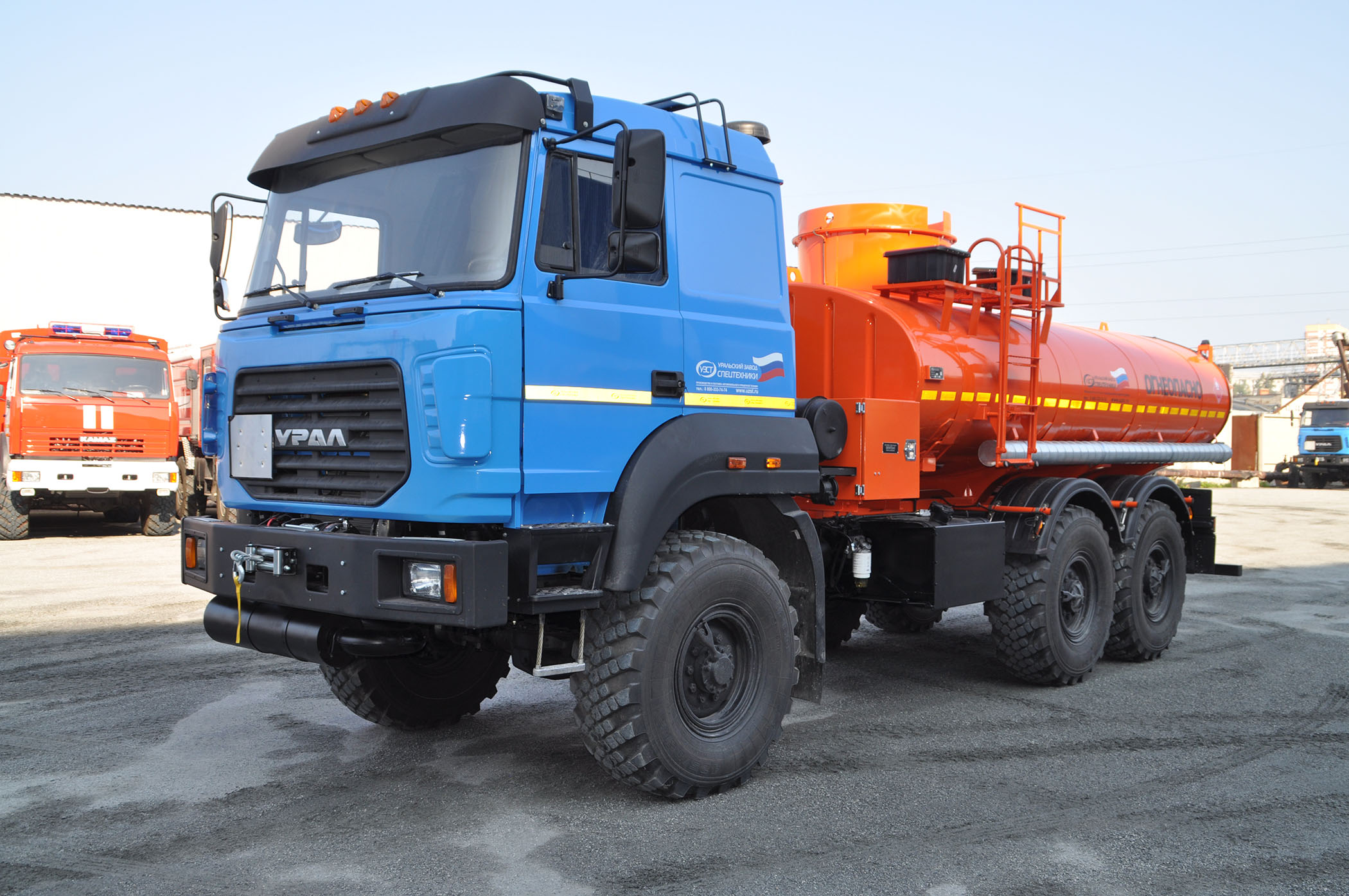 УРАЛ 4320-1951-60 (70) без спального места, объем емкости 10 куб.м.1 секция, насос СВН-80, привод карданный, сечение цистерны чемоданное или элипсное, средства безопасности, доработка шасси под ЛВЖ.