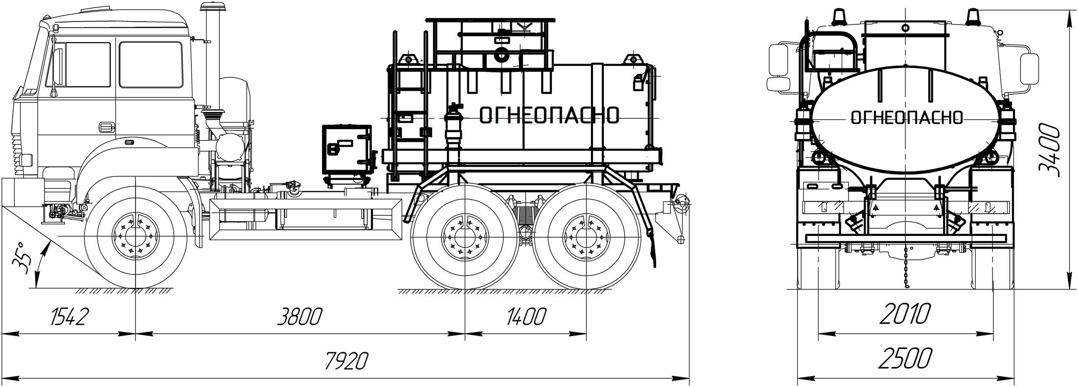 6х6, 230 л.с., 10 м³, 1 секция, насос СЦЛ-00, чемоданное сечение, УВТ между кабиной и цистерной с левой стороны