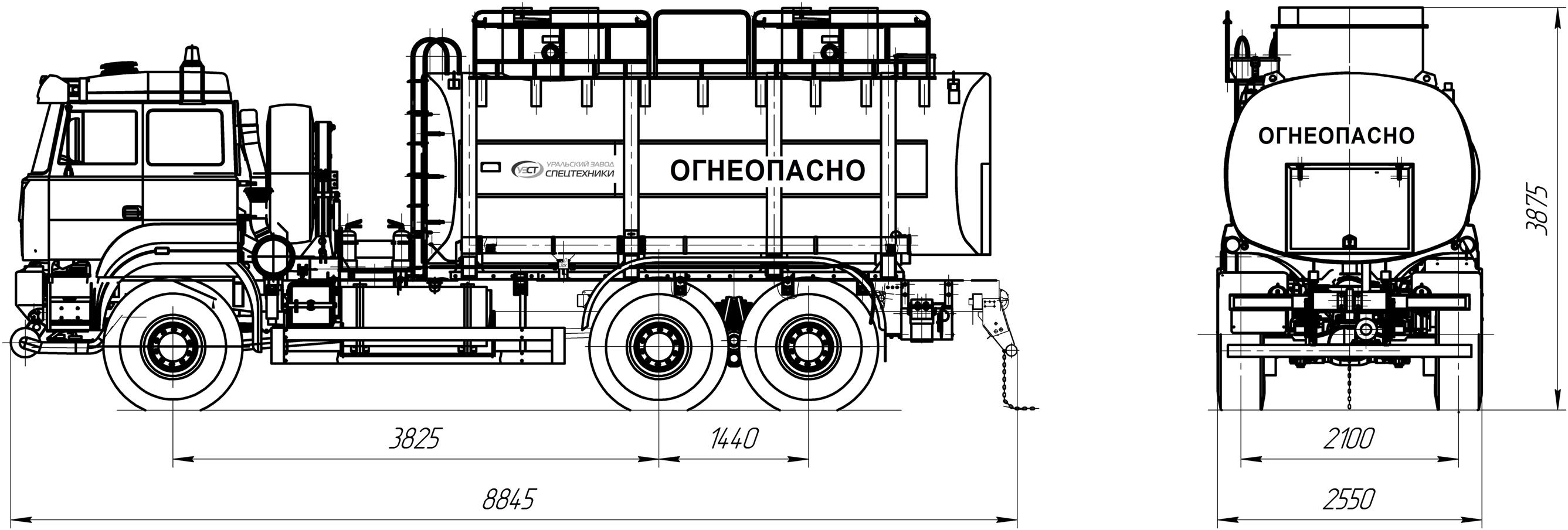 6х6, 312 л.с., 12 м³, 1 секция, насос УЗСТ СВН-80, чемоданное сечение, УВТ между кабиной и цистерной с левой стороны