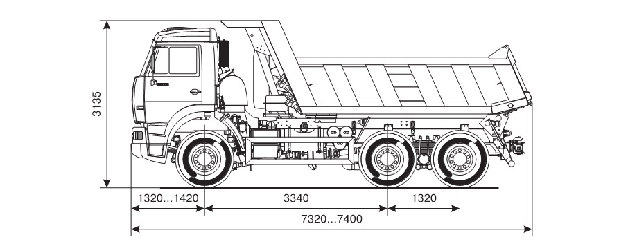 Колёсная формула: 6х6; Тип ошиновки: 2; Г/П,т.: 14; Мощность двиг. л.с.: 280; Модель КП: 154; П/ о главн. передачи: 4,98; V платф.куб.м./ монт.дл.рамы мм.: 8,2; Шины: 11.00R20 11.00R22,5; Бак, л.: 2х210; ТСУ(высота ССУ): шк-пет.; зад.разгрузка, обогрев платф., МКБ, МОБ, дв. КАМАЗ 740.622-280, топл.ап. BOSCH, Common Rail, рестайлинг.