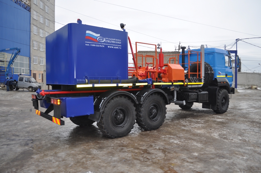 Агрегат цементировочный 5870-01 на шасси УРАЛ 4320-4972-80 (82) со спальным местом, насос высокого давления с редуктором СИН-32.00.400.000 трехплунжерный (диаметр плунжеров 100 мм), привод от КОМ, бак мерный 6 куб.м.. цементный бак 0,25 куб.м., трубопровод приемный 100 мм, трубопровод напорный 50 мм, Pmax=32 мПа, D=125 мм, средства ЗИП, средства безопасности