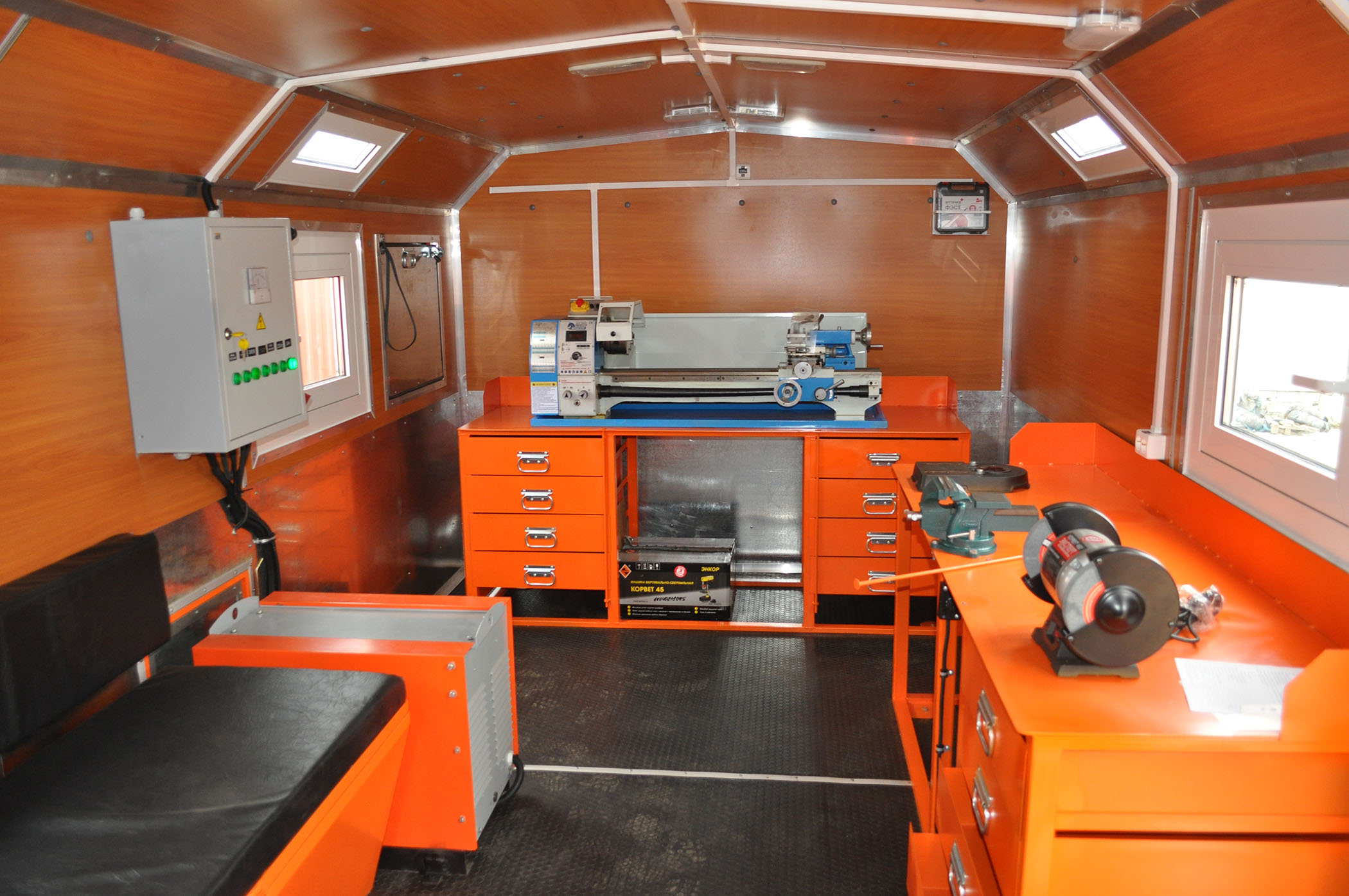 6х6, 275 л.с., КПП ЯМЗ-1105, генератор EG.202, токарный станок, вертикально-сверлильный станок, двухдисковый шлифовальный станок, верстак, умывальник