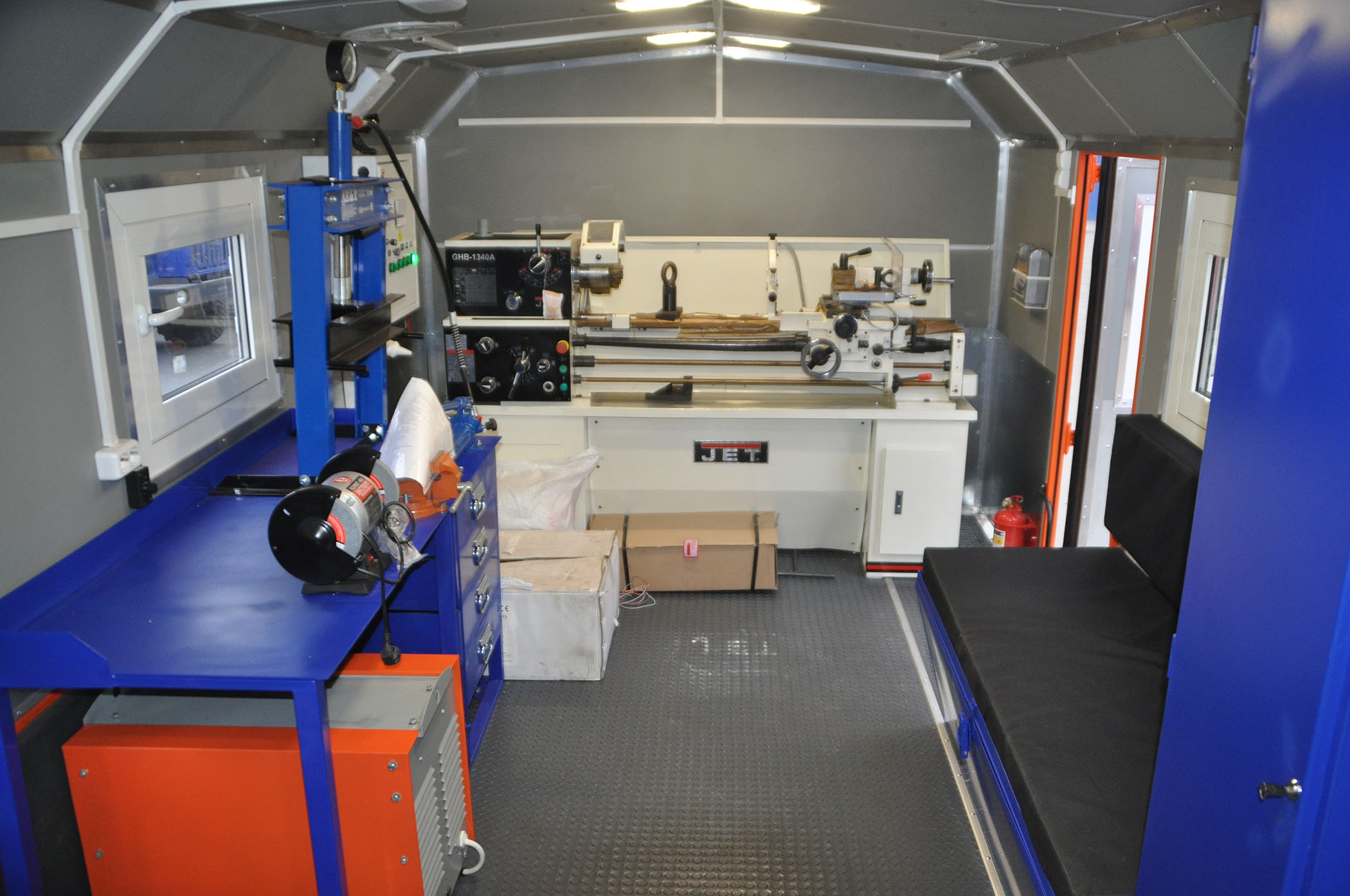 6х6, 230 л.с., КПП ЯМЗ-2361, генератор EG-202, вертикально-сверлильный станок, точильно-шлифовальный станок, токарный станок, верстак, умывальник, шкаф