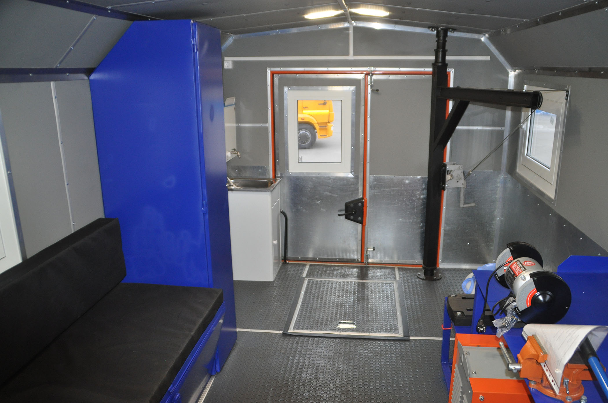 распределительный щит - 1 шт разъем для подключения к внешнему источнику питания 380В (20кВт) розетки 220В - 2 шт розетки 380В - 1 шт. стол откидной диван-рундук - 1 шт. синхронный генератор EG-202 с приводом от шасси верстак с выдвижными ящиками - 1 шт тисы 100 мм - 1 шт. умывальник с подогревом шкаф. |