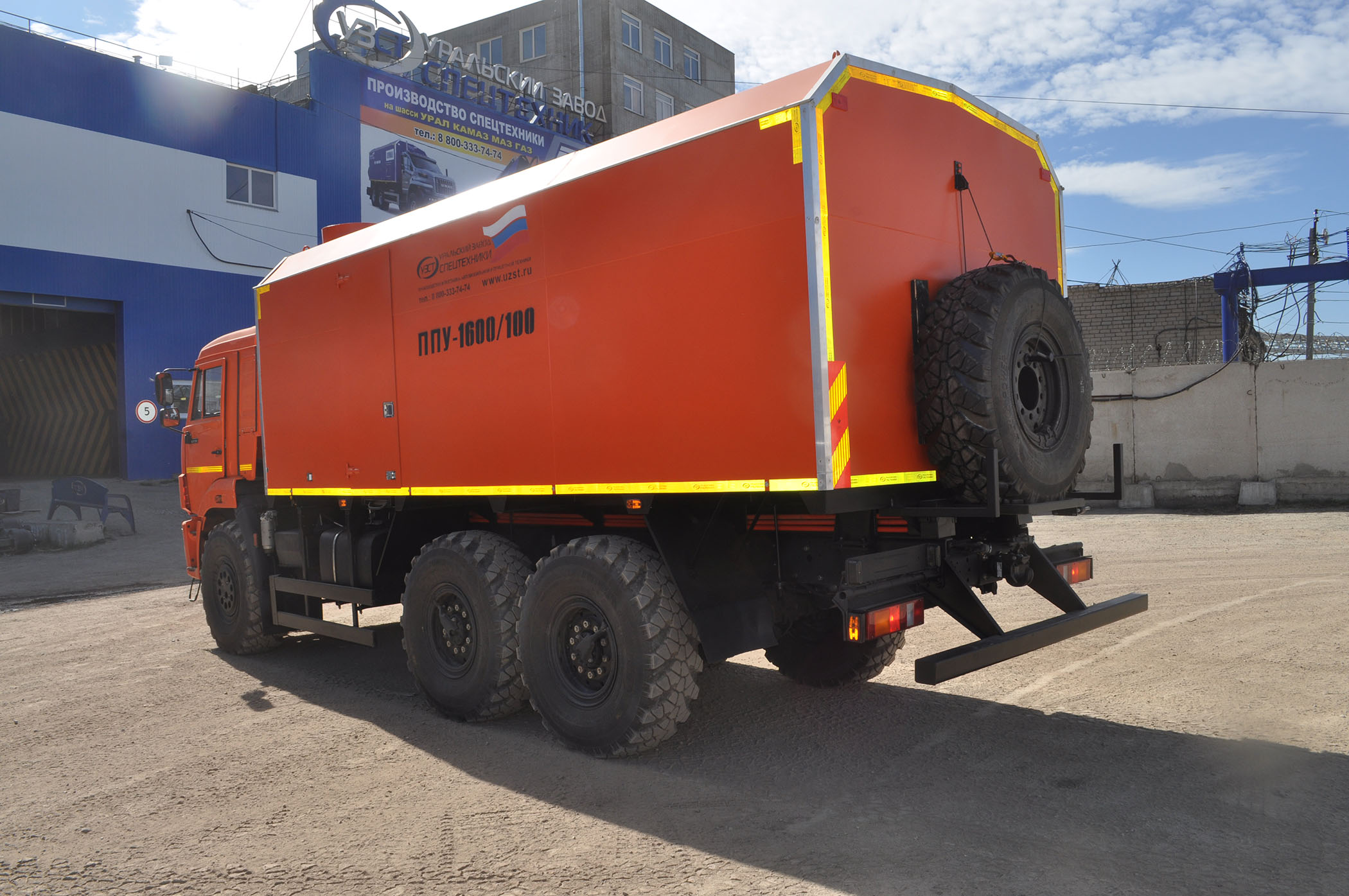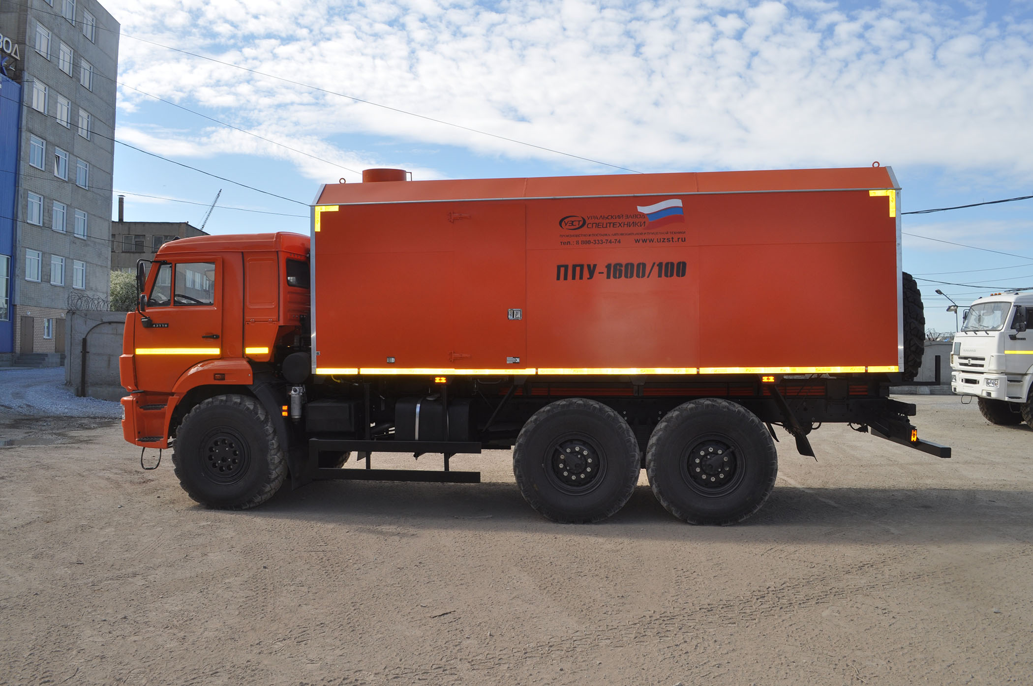 ППУ 1600/100 на шасси КАМАЗ-43118 со спальным местом, насос 1,1ПТ-25Д1М2 или 2,3ПТ-25Д1М2, вентилятор ВР12-26-4, топливный насос НШ-10, бак для воды 5,2 куб.м., топливные баки 2x0,3 куб.м., устройство горелочное - двухфорсуночное (форсунки Danfoss), КИП, средства безопасности