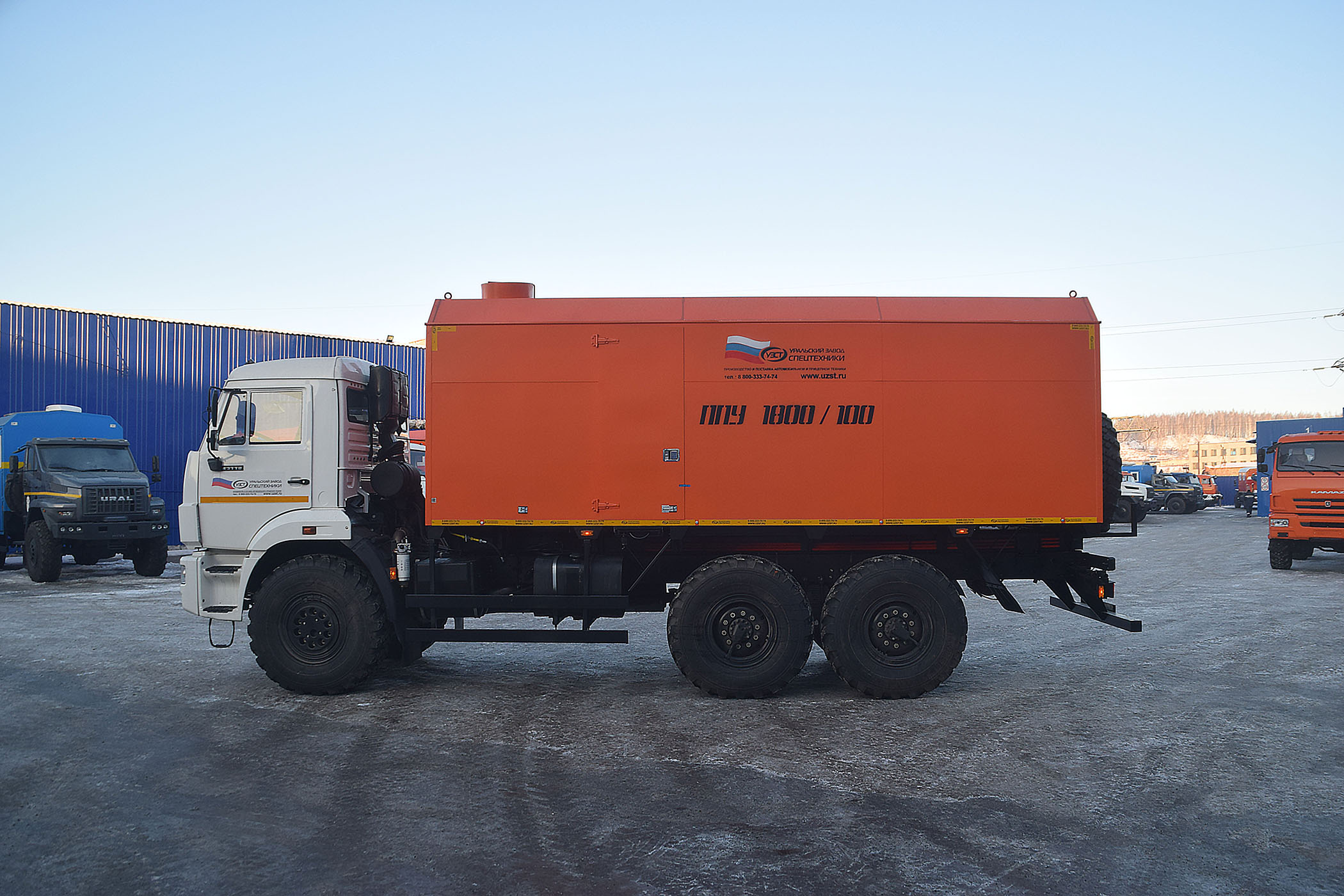 ППУ 1600/100 на шасси КАМАЗ-43118 без спального места, насос 1,1ПТ-25Д1М2 или 2,3ПТ-25Д1М2, вентилятор ВР12-26-4, топливный насос НШ-10, бак для воды 5,2 куб.м., топливные баки 2x0,3 куб.м., устройство горелочное - двухфорсуночное (форсунки Danfoss), КИП, средства безопасности