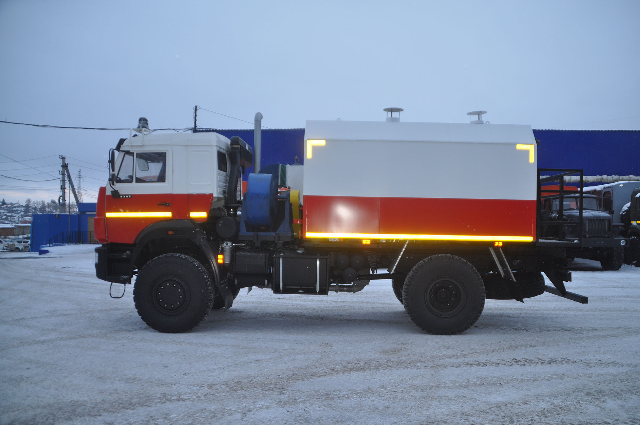 УМПП-400 УЗСТ 6892-02 на шасси КАМАЗ-43502-3036-45/3038-45 без спального места, вентилятор ВР-280-46-5, горелки Riello RG4S (220 В) – 2 шт., бак топливный 350 л., теплообменник - двухсекционный трубчатый из нержавеющей жаропрочной стали, количество выводов для рукавов - 3, вместимость пеналов для рукавов - 10, средства безопасности.