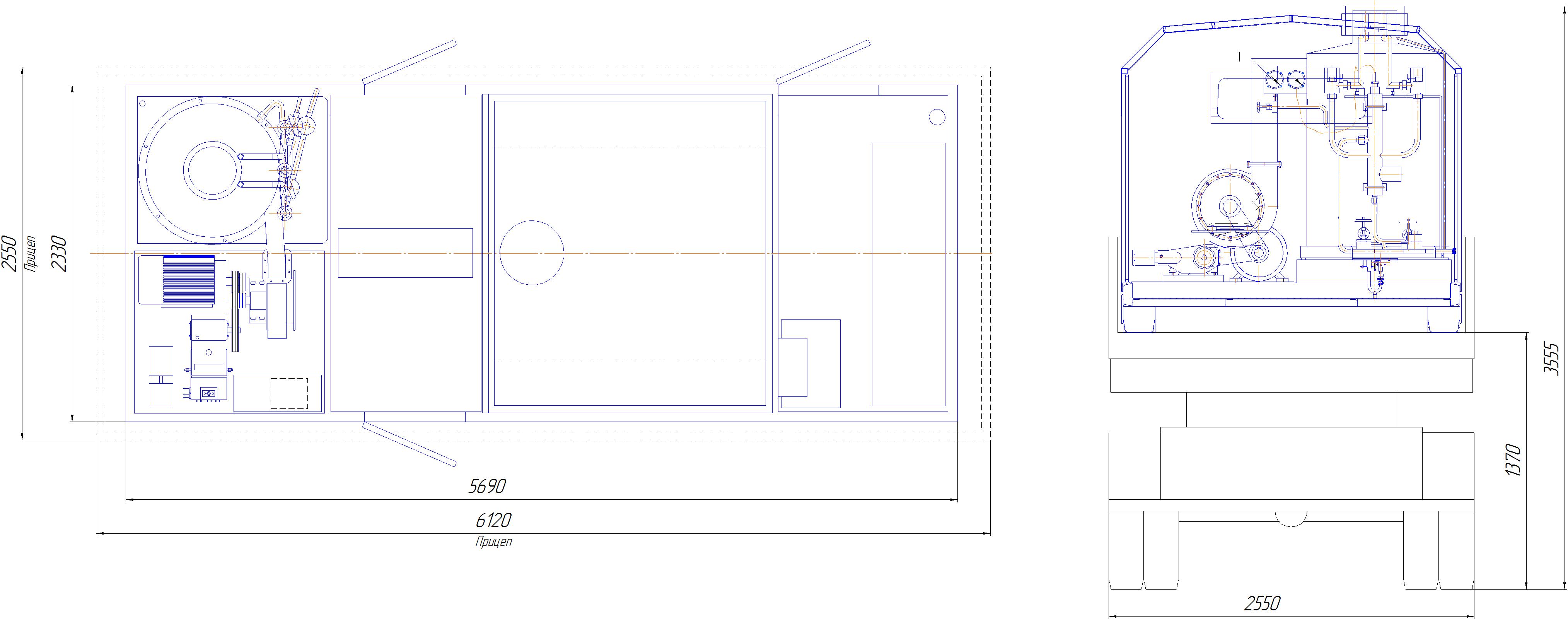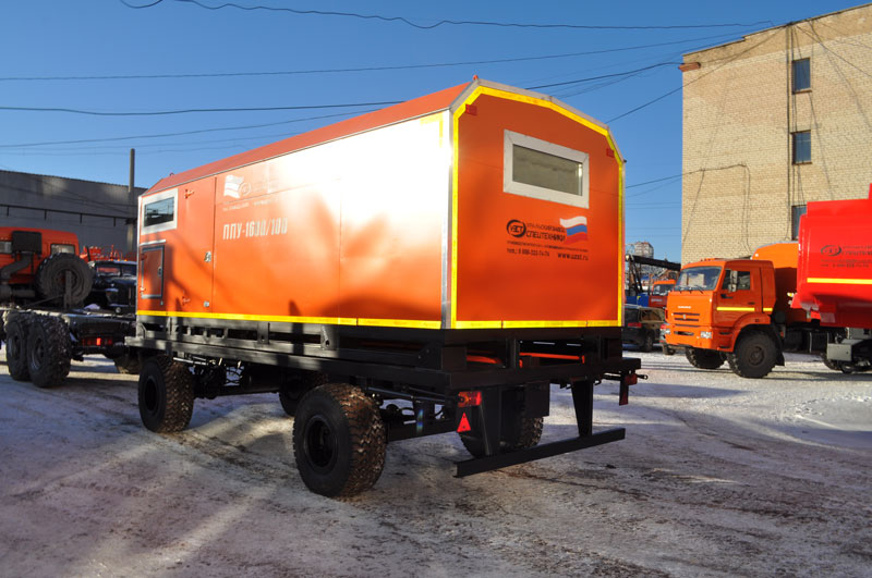 ППУ-1600/100 на прицепе, бак для воды 4,2 куб.м., топливные баки 2x0,3 куб.м., вентилятор ВР12-26-4 правого вращения, насос топливный НМШ-2-40 с электродвигателем, устройство горелочное - двухфорсуночное (форсунки Danfoss), КИП, средства безопасности