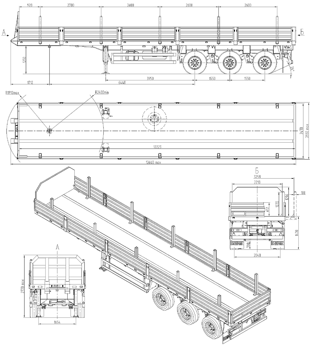 34600 кг, шины 385/65 R22,5/6+1, длина 12223 мм, ССУ 1250 мм, рессорная подвеска