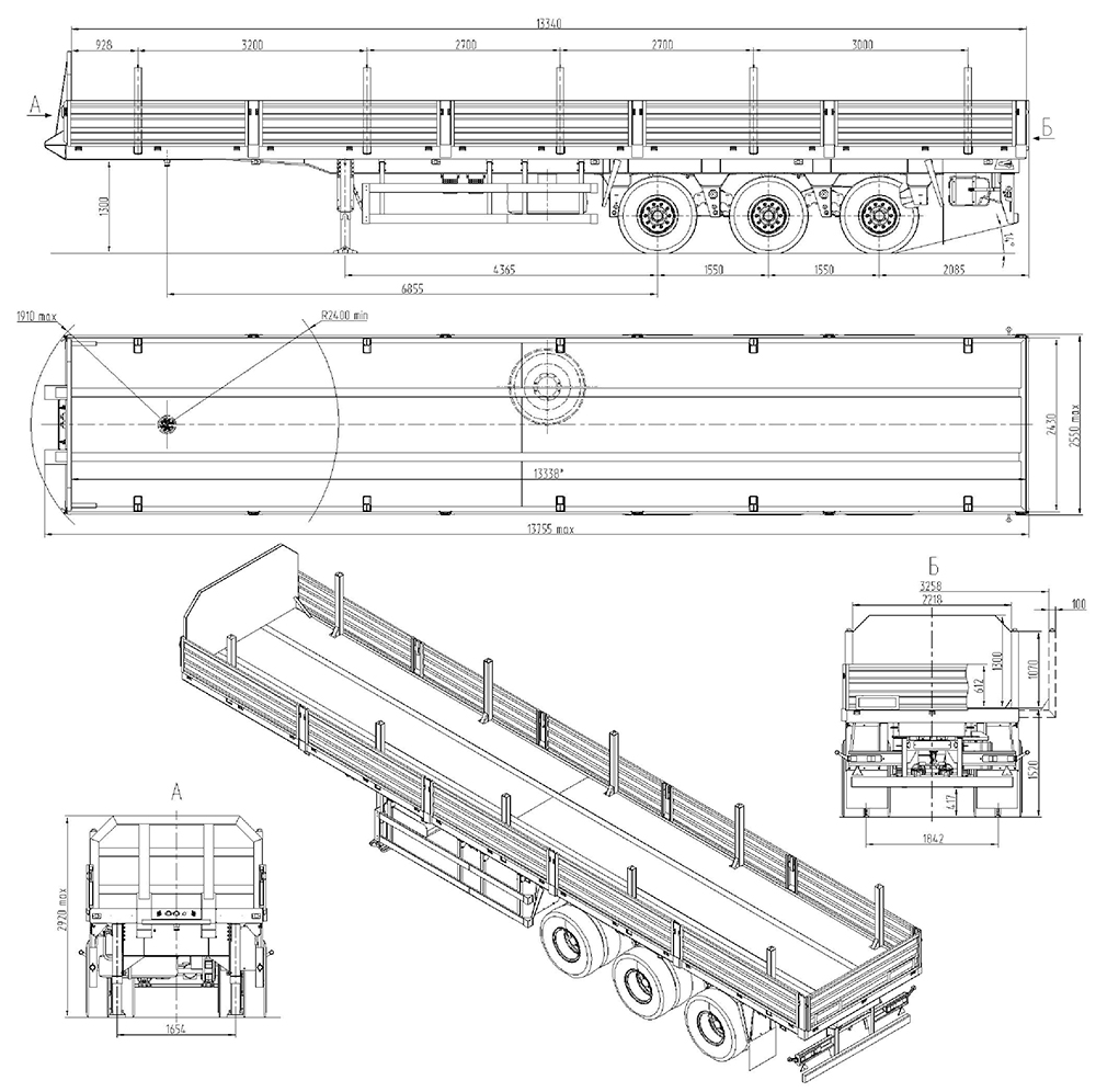 34000 кг, шины 385/65R22,5/6+1, длина 13338 мм, ССУ 1150 мм, пневматическая подвеска