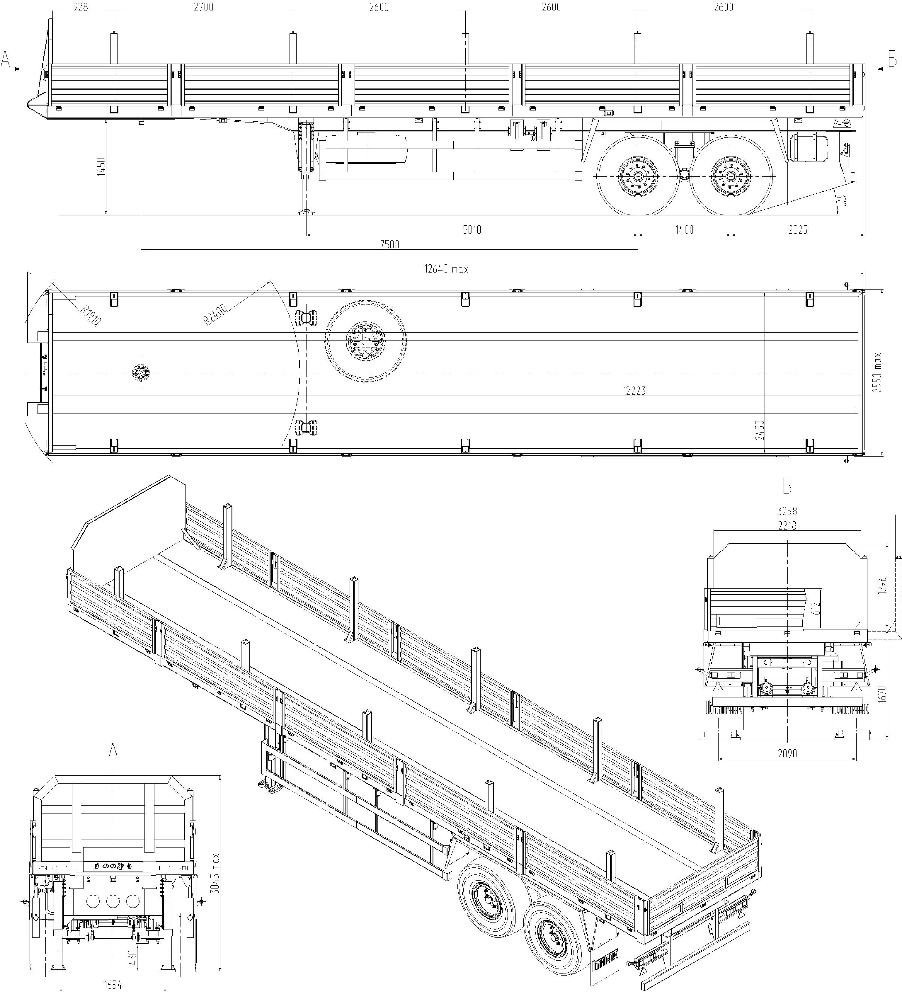 395/85R20 кг, длина платформы 12260 мм, ССУ 1500 мм, подвеска балансирный мост BPW или HJ без реактивных штанг, 2 оси, шины 395/85R20 или 445/65R22,5/4+1, съемные борта 620 мм, раздвижные коники 1500 мм, усиленный передний щит, опции: задний усиленный щит, Ш-образные коники для НКТ трубы, буровых штанг, обрезинивание коников