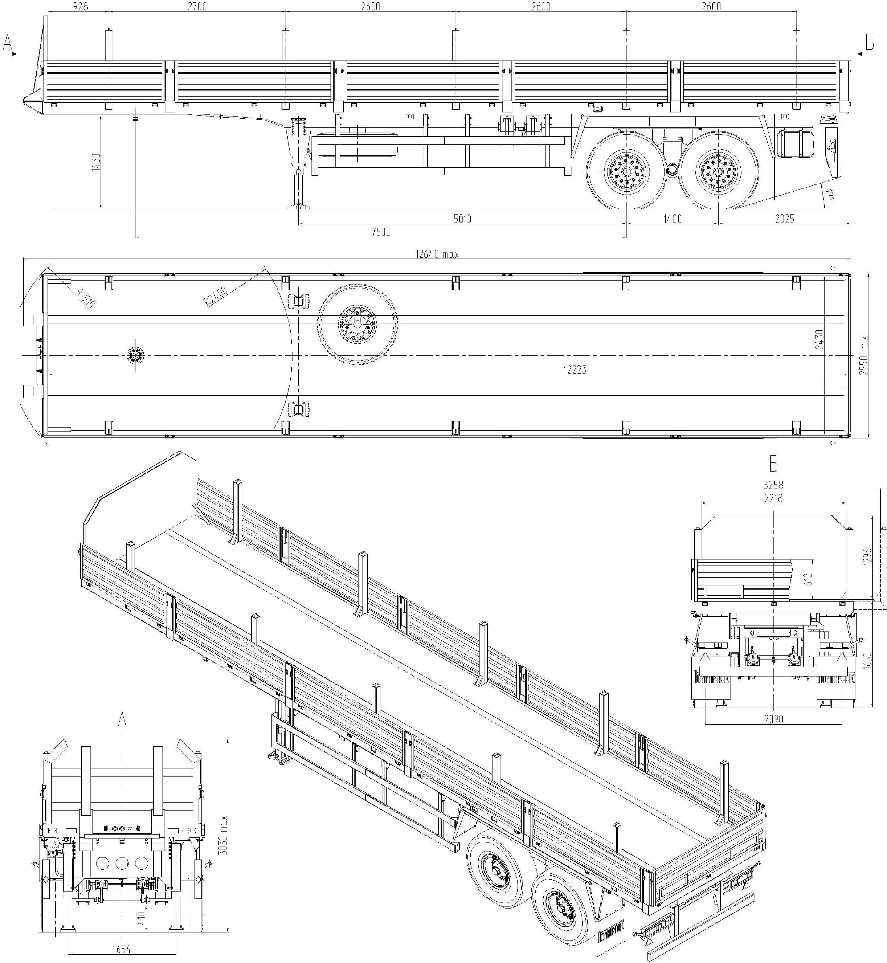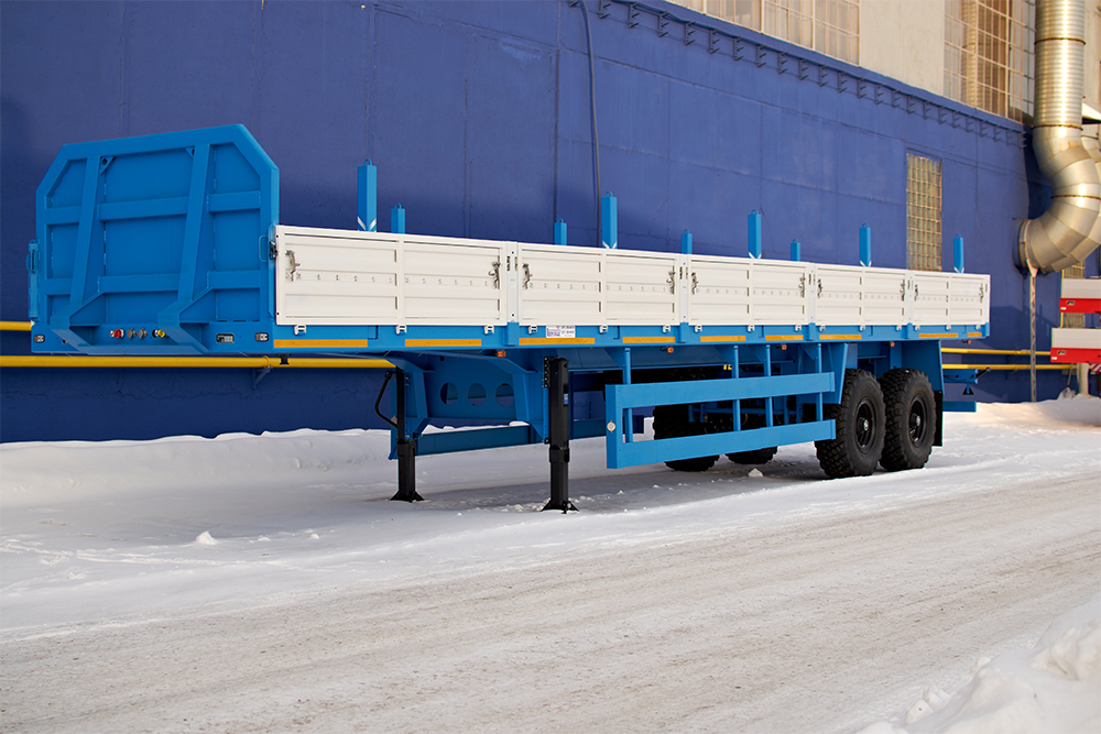 22000 кг, длина платформы12260 мм, ССУ 1430 мм, пневматическая или рессорная подвеска BPW или HJ, 2 оси, шины 385/65R22,5 / 4+1, съемные борта 620 мм, раздвижные коники 1500 мм, усиленный передний щит, опции: задний усиленный щит, Ш-образные коники для НКТ трубы, буровых штанг, обрезинивание коников