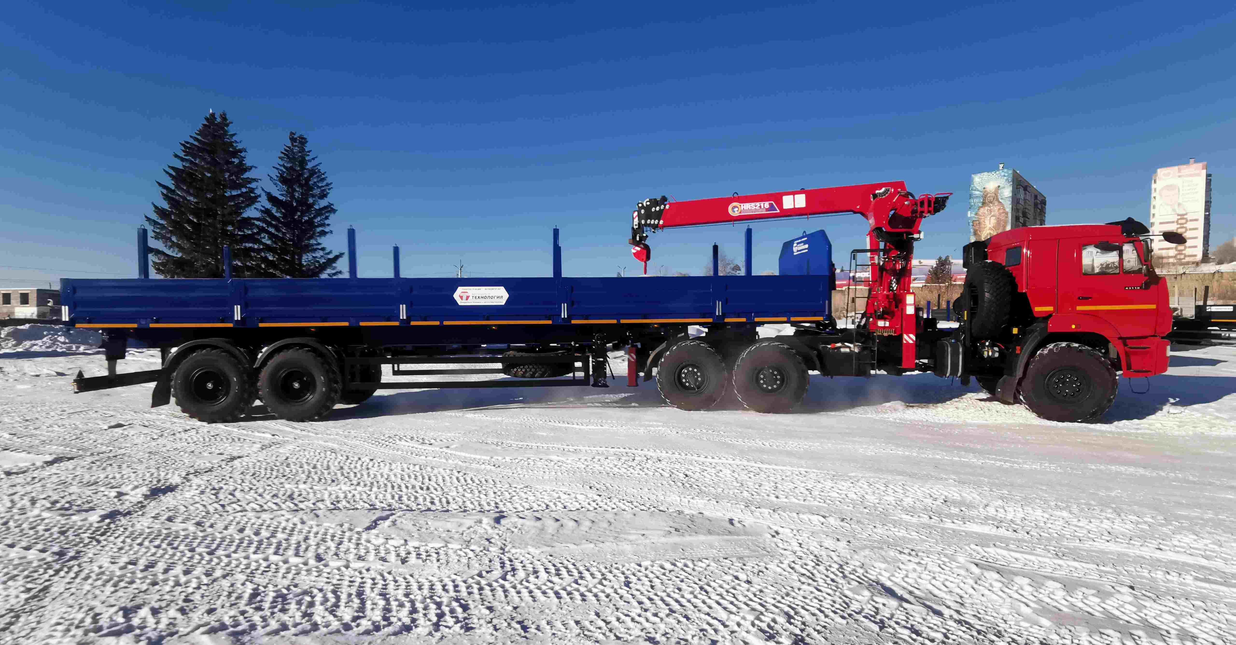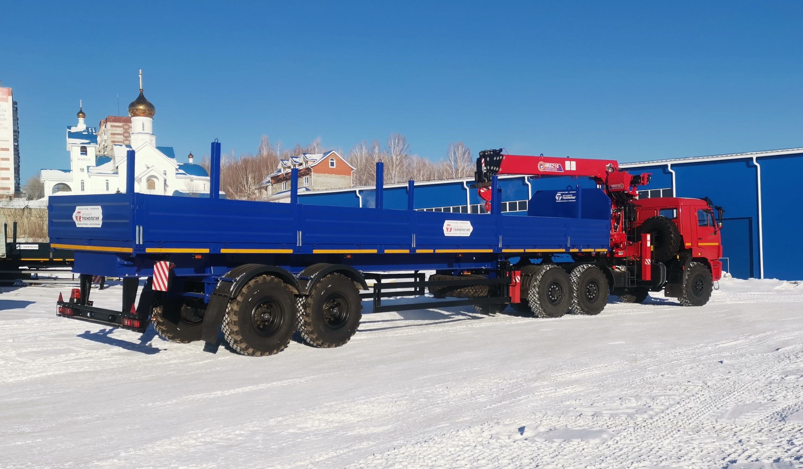 22000 кг, длина платформы12260 мм, ССУ 1430 мм, пневматическая подвеска BPW или HJ, 2 оси, шины 425/85R21/4+1, съемные борта 620 мм, раздвижные коники 1500 мм, усиленный передний щит, опции: задний усиленный щит, Ш-образные коники для НКТ трубы, буровых штанг, обрезинивание коников
