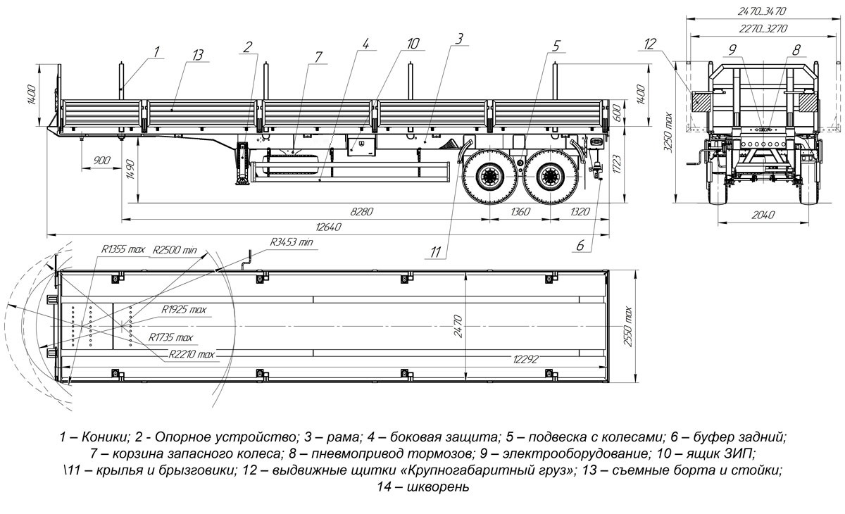 28500 кг, длина платформы 12260 мм, ССУ 1430 мм, подвеска балансирный мост BPW или HJ без реактивных штанг, 2 оси, шины 14.00R20/4+1, съемные борта 620 мм, раздвижные коники 1500 мм, усиленный передний щит, опции: задний усиленный щит, Ш-образные коники для НКТ трубы, буровых штанг, обрезинивание коников