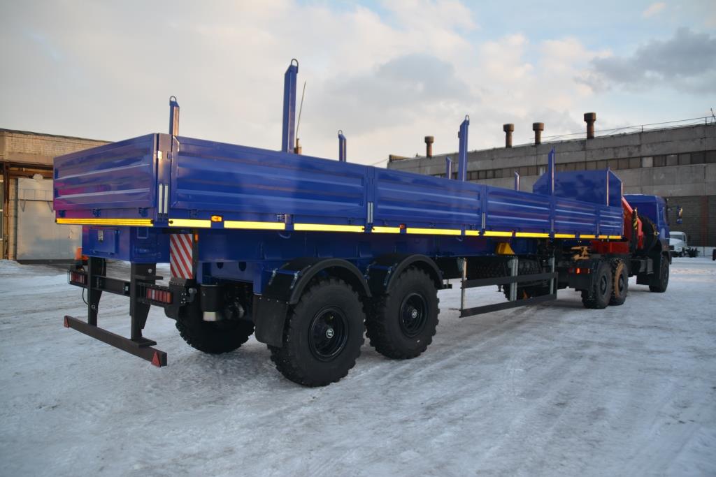 Опции: лебедки для увязки груза с барабаном под трос и ремень, корзина для перевозки бортов, задний усиленный щит, Ш-образные коники для НКТ трубы, буровых штанг, обрезинивание коников, выдвижные или приставные лестницы |