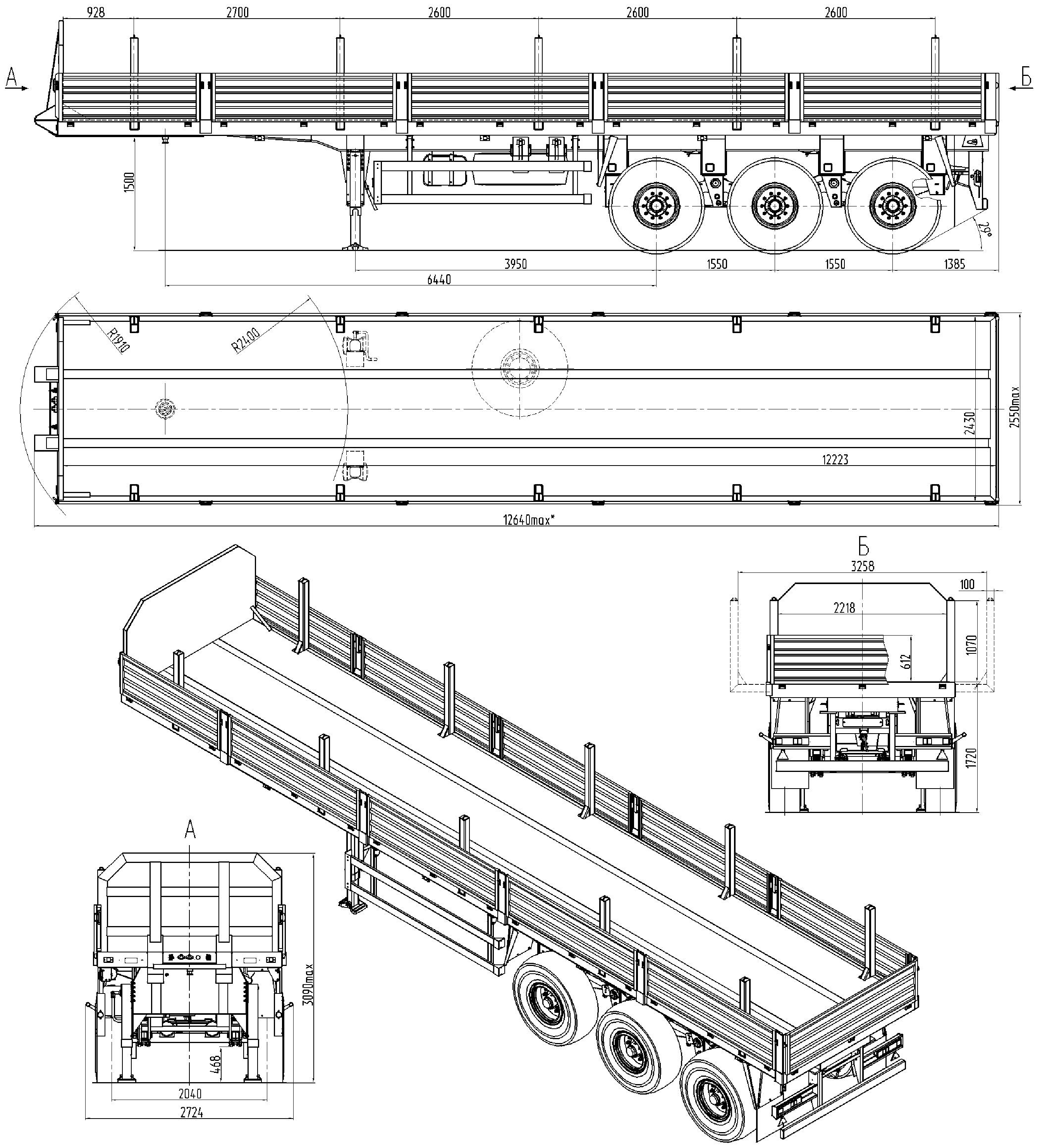 28500 кг, шины 425/85 R21/6+1, длина 12223 мм, ССУ 1500 мм, рессорная подвеска, 3 оси