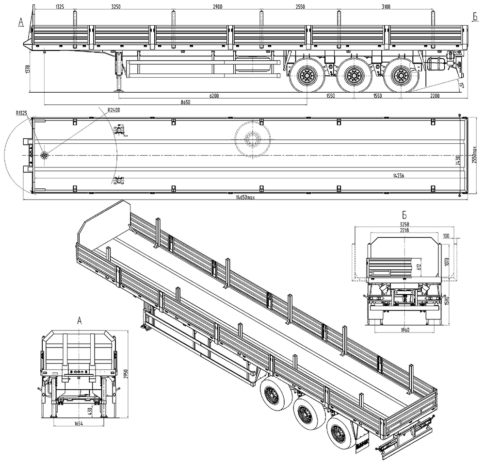 25000 кг, облегченная конструкция (нагрузка на каждую ось полуприцепа и седельного тягача - не более 7400 кг), рама - с запасом прочности до 30000 , оси и подвеска - с запасом прочности до 35000 кг, шины 425/85R21 или 385/65R22,5 / 6+1, длина платформы 12260 мм, высота ССУ 1430 мм, пневматическая подвеска BPW или HJ, 3 оси, съемные борта 620 мм, раздвижные коники 1500 мм, усиленный передний щит, опции: задний усиленный щит, Ш-образные коники для НКТ трубы, буровых штанг, обрезинивание коников