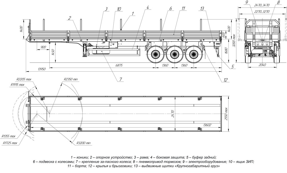 Полуприцеп бортовой ППБ-34, 13.5 метров, пневматическая или рессорная подвеска, автошины 425/85R21 Полуприцеп бортовой ППБ-34, 13.5 метров, пневматическая или рессорная подвеска, автошины 425/85R21