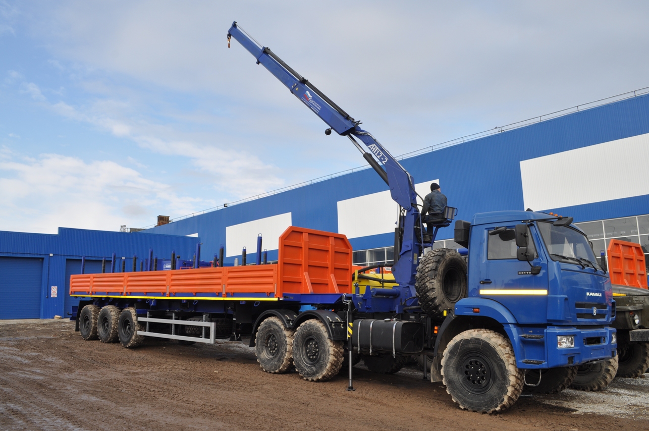 Опции: лебедки для увязки груза с барабаном под трос и ремень, корзина для перевозки бортов, задний усиленный щит, Ш-образные коники для НКТ трубы, буровых штанг, обрезинивание коников, выдвижные или приставные лестницы |