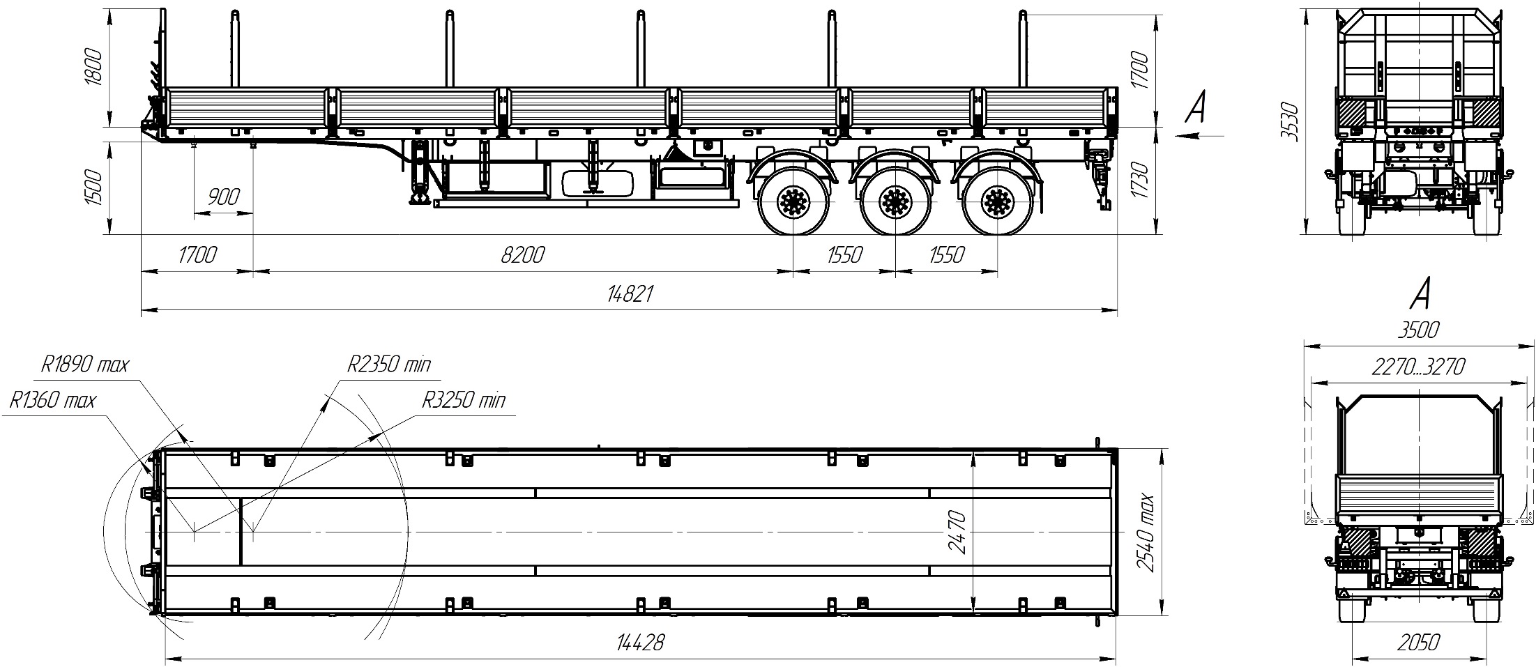 Полуприцеп бортовой ППБ-34, 14.5 метров, пневматическая или рессорная подвеска, автошины 385/65R22,5 или 425/85R21 Полуприцеп бортовой ППБ-34, 14.5 метров, пневматическая или рессорная подвеска, автошины 385/65R22,5 или 425/85R21