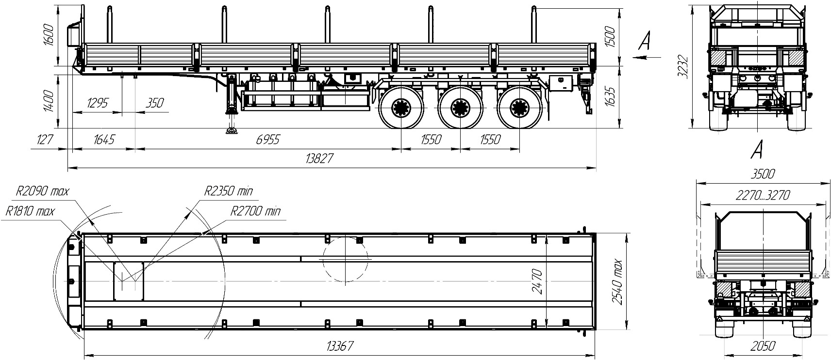 34000 кг, длина платформы 13602 мм, высота ССУ 1450 мм, пневматическая или рессорная подвеска BPW или HJ, 3 оси, шины 385/65R22,5 / 6+1, съемные борта 620 мм, раздвижные коники 1500 мм, усиленный передний щит, опции: задний усиленный щит, Ш-образные коники для НКТ трубы, буровых штанг, обрезинивание коников