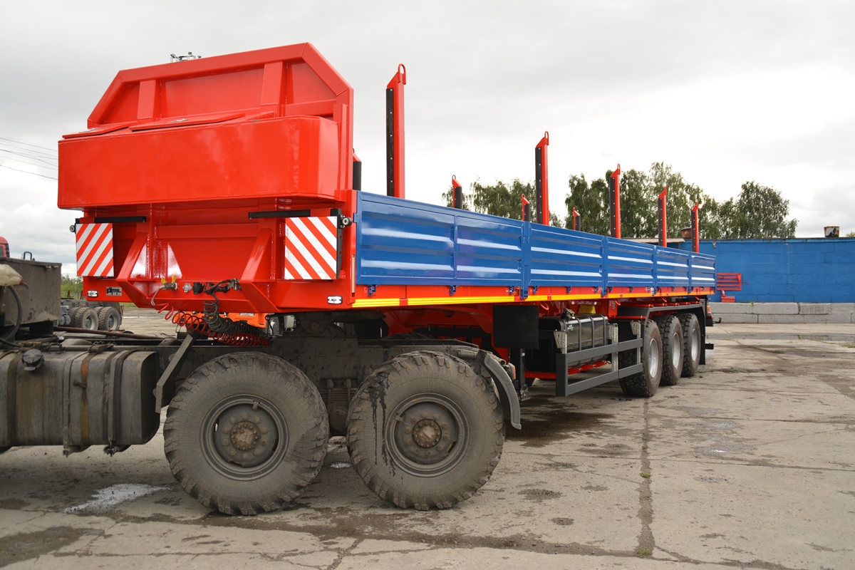 25000 кг, облегченная конструкция (нагрузка на каждую ось полуприцепа и седельного тягача - не более 7400 кг), рама - с запасом прочности до 30000 , оси и подвеска - с запасом прочности до 35000 кг, шины 425/85R21 или 385/65R22,5 / 6+1, длина платформы 12260 мм, высота ССУ 1430 мм, пневматическая подвеска BPW или HJ, 3 оси, съемные борта 620 мм, раздвижные коники 1500 мм, усиленный передний щит, опции: задний усиленный щит, Ш-образные коники для НКТ трубы, буровых штанг, обрезинивание коников