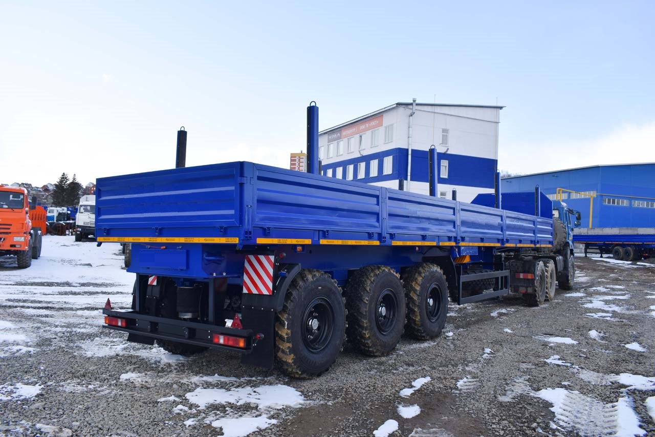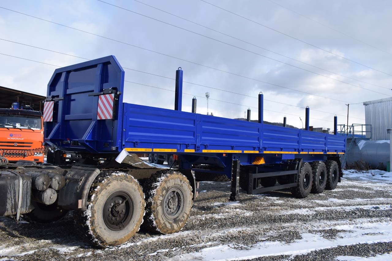 34500 кг, длина платформы 12260 мм, высота ССУ 1450 мм, рессорная подвеска HJ, 3 оси, шины 425/85R21 / 6+1, съемные борта 620 мм, раздвижные коники 1500 мм, усиленный передний щит, опции: задний усиленный щит, Ш-образные коники для НКТ трубы, буровых штанг, обрезинивание коников