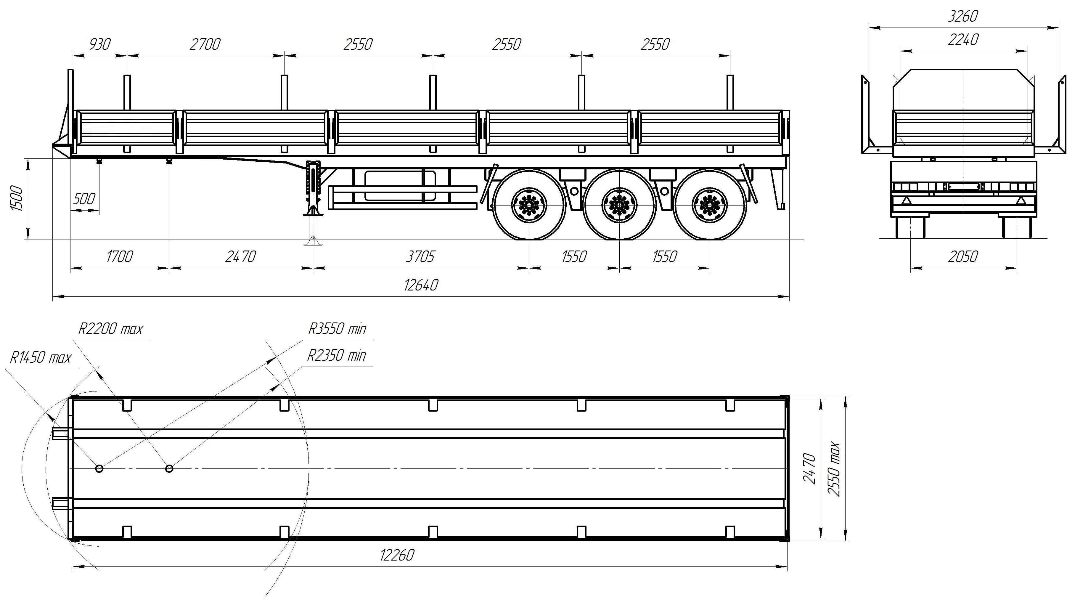 34800 кг, длина платформы 12260 мм, высота ССУ 1450 мм, пневматическая подвеска BPW или HJ, 3 оси, шины 425/85R21 / 6+1, съемные борта 620 мм, раздвижные коники 1500 мм, усиленный передний щит, опции: задний усиленный щит, Ш-образные коники для НКТ трубы, буровых штанг, обрезинивание коников