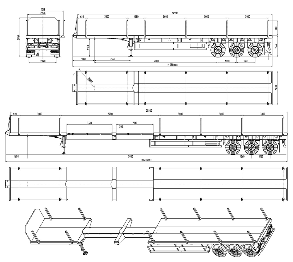 32000 кг, шины 385/65R22,5/6+1, длина 14200-20200 мм, ССУ 1340 мм, пневматическая подвеска