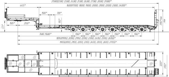 95000 в сдвинутом положении / 70000 кг в раздвинутом положении, шины 235/75R17,5/32+2, платформа 16000 до трапов в сдвинутом положении/ 24000 до трапов в раздвинутом положении x 3200 мм, уширители до 3700 мм ССУ – под заказ, пневматическая подвеска с управляемыми осями