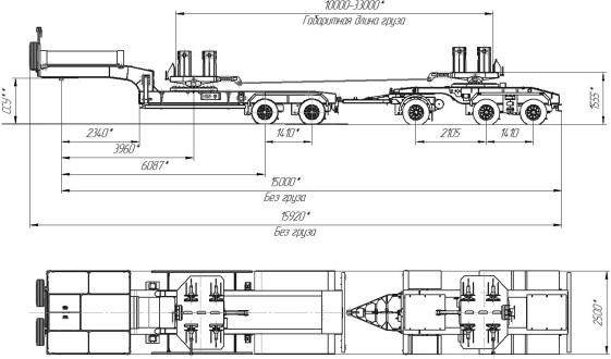 60000 кг (для неделимых грузов), шины 235/75R17,5/20+2, платформа 10000 мм сдвинутом положении/ 33000 мм в раздвинутом положении x 2500, ССУ – под заказ, пневматическая подвеска с управляемыми осями, поворотные круги под кронштейнами для груза