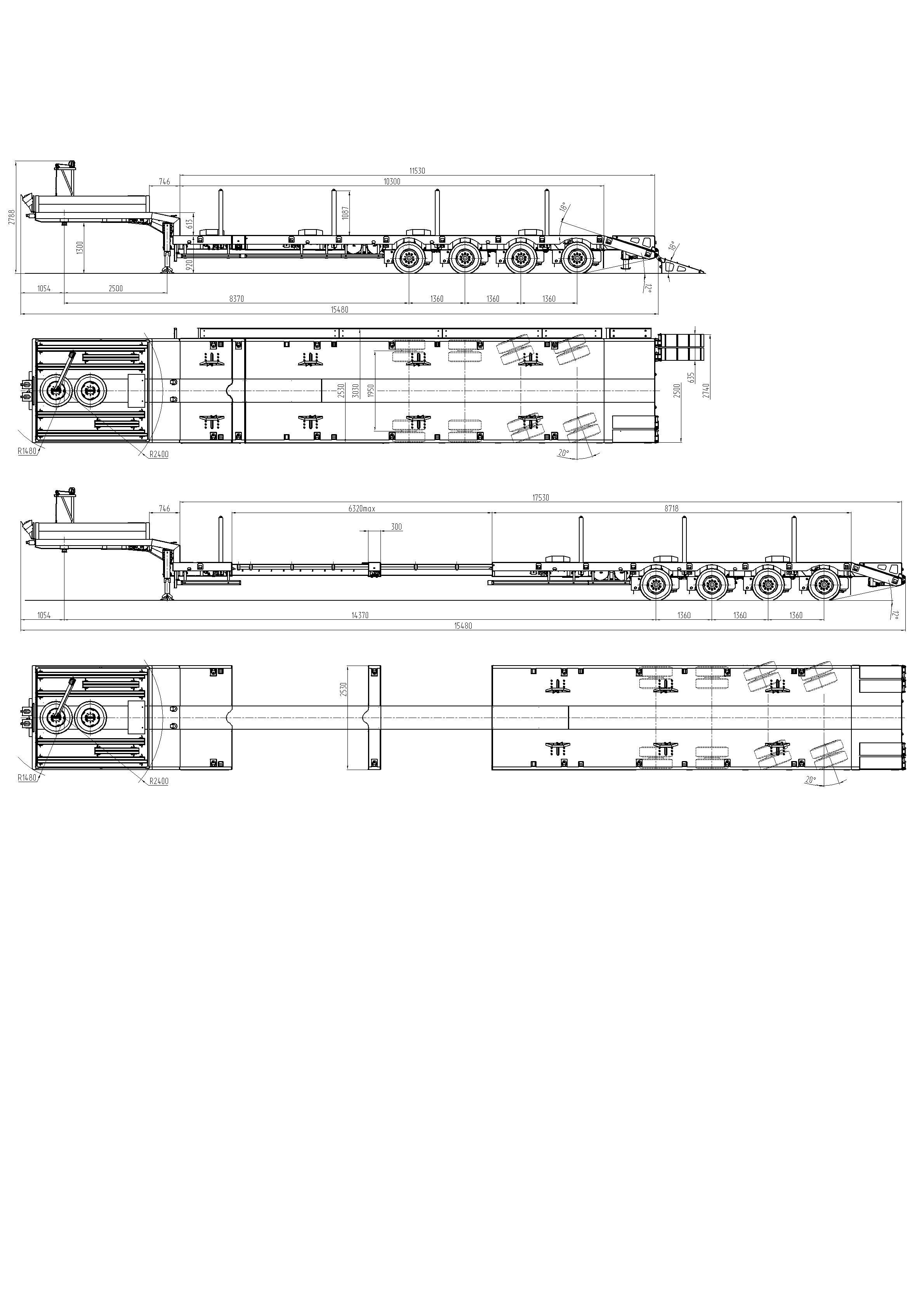 49300 в сдвинутом положении / 45300 кг в раздвинутом положении, шины 235/75R17,5/16+2, платформа 11530 по трапам в сдвинутом положении/ 17530 по трапам в раздвинутом положении x 2530, уширители до 3030 мм, съемные стойки 1090 мм, ССУ – под заказ, пневматическая подвеска