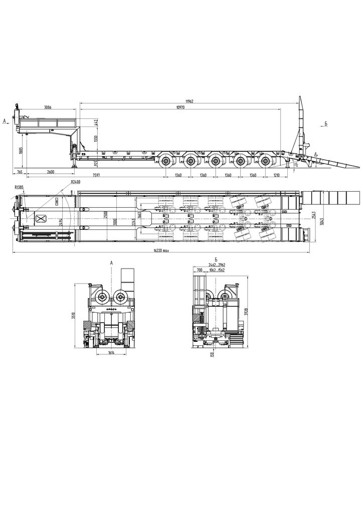 63000 кг, шины 235/75R17,5/20+2, платформа 10000 (11000 до трапов) x 2500 мм, уширители до 3000 мм, ССУ- под заказ, пневматическая подвеска