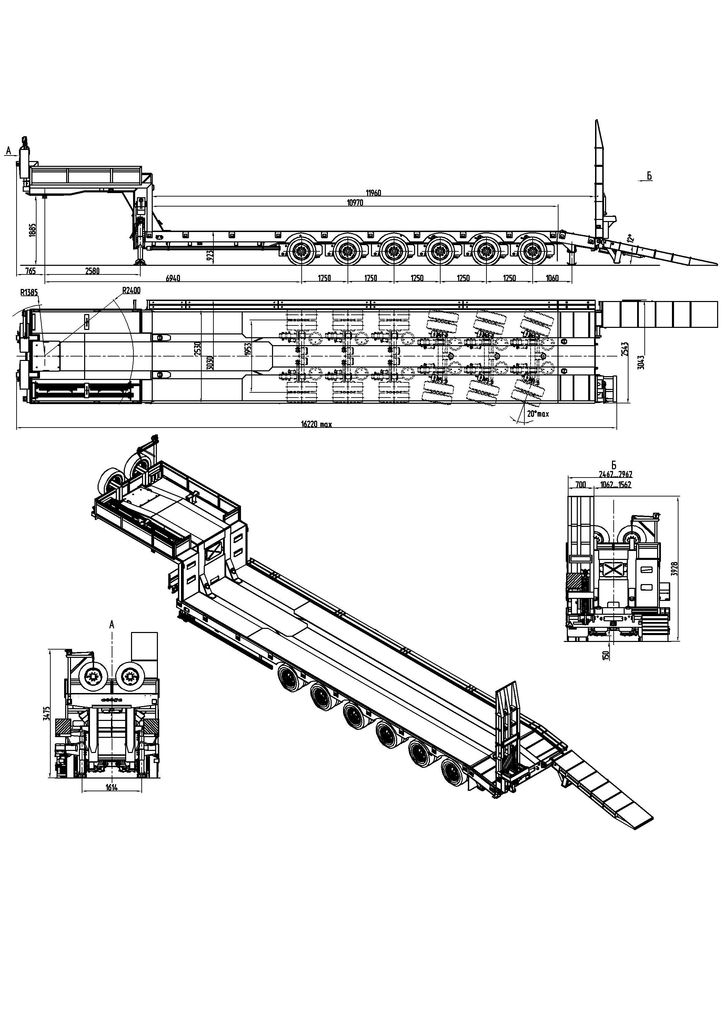 73000 кг, шины 245/70R17,5/24+2, платформа 10970 (11960 до трапов) x 2530 мм, уширители до 3030 мм, ССУ- под заказ, пневматическая подвеска