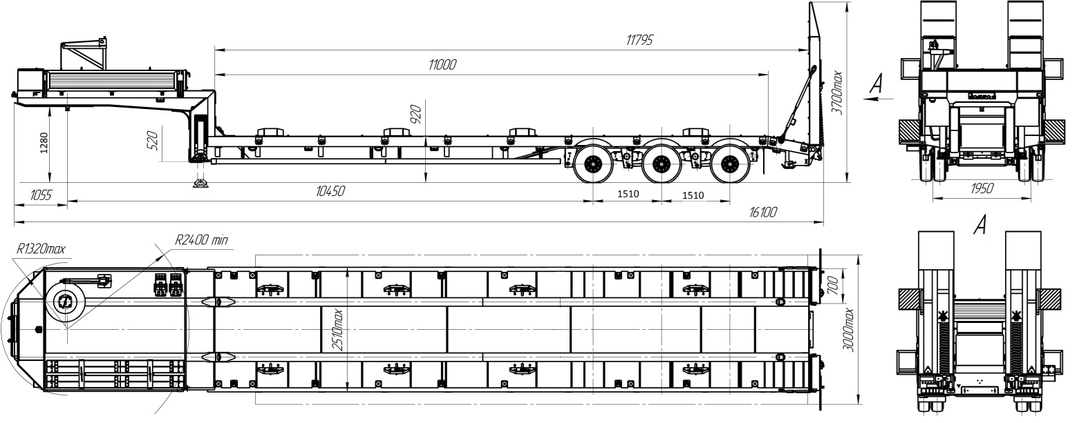 45000 кг, шины 245/70R17,5/12+2, платформа 10850 до трапов, уширители до 3000 мм, вставные стойки 1500 мм, ССУ под заказ, пневматическая подвеска, механические трапы.