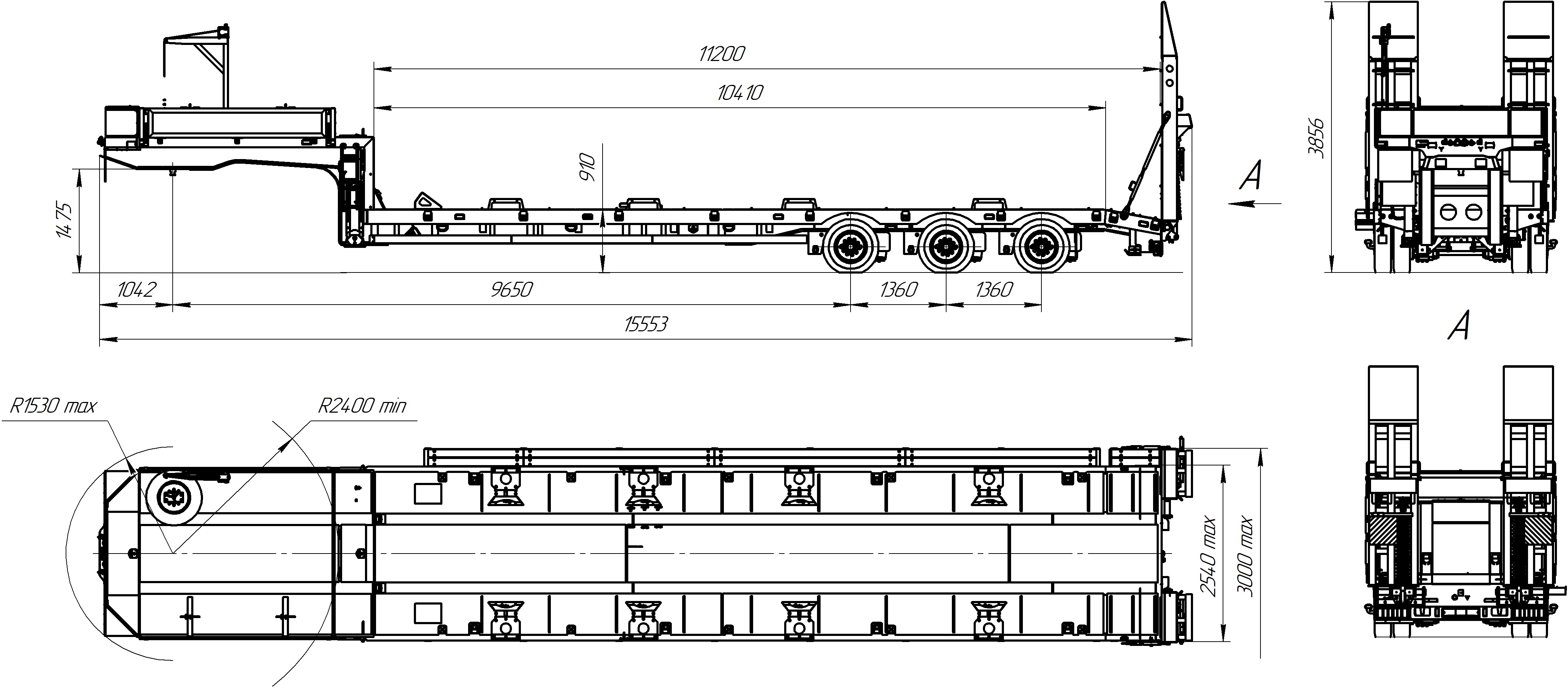 39300 кг, шины 235/75R17,5/12+2, платформа 10978 (12026 по трапам) x 2530 мм с уширителями до 3030 мм, съемные стойки, ССУ- под заказ, рессорная или пневматическая подвеска, треугольные аппарели