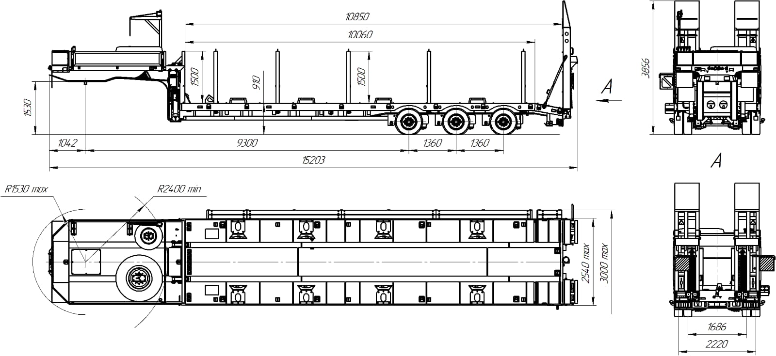 45000 кг, шины 245/70R17,5/12+2, платформа 10850 до трапов, уширители до 3000 мм, вставные стойки 1500 мм, ССУ под заказ, пневматическая подвеска, механические трапы.