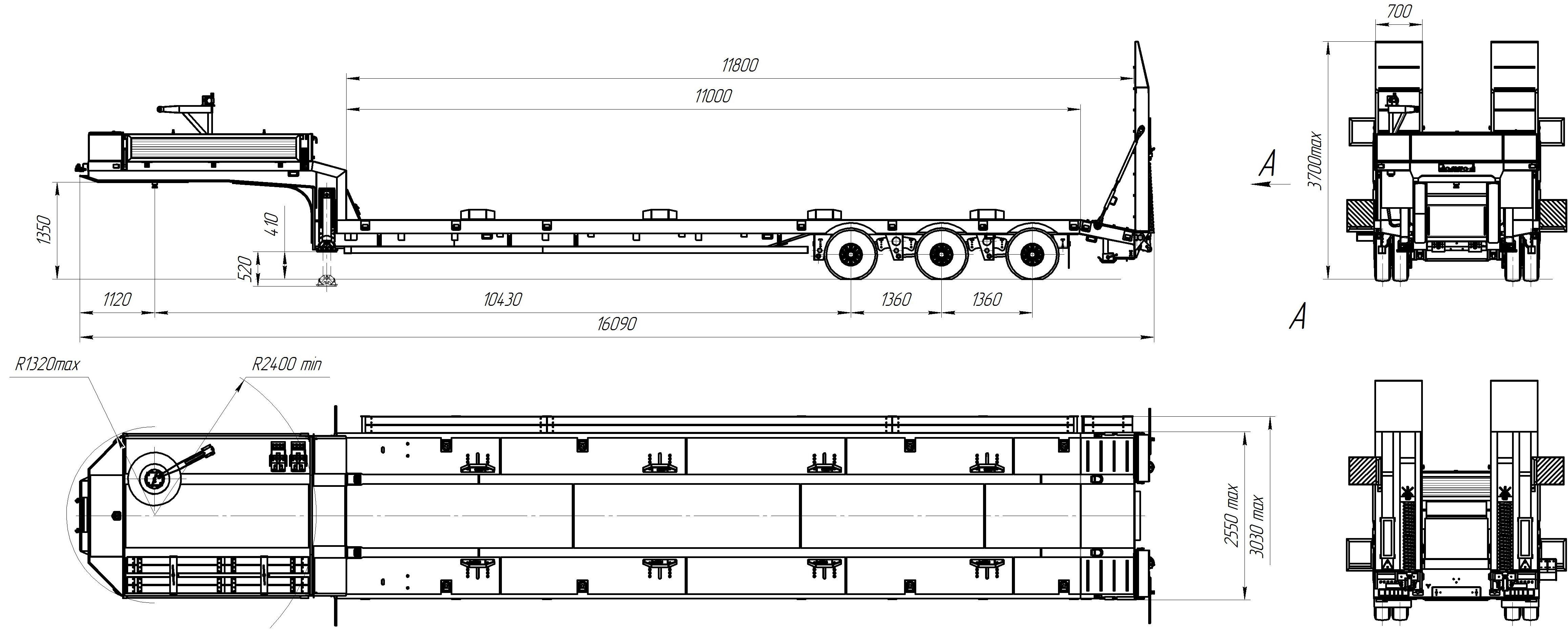 45000 кг, шины 245/70R17,5/12+2, платформа 9640 (10635 до трапов) x 2530 мм с уширителями до 3030 мм, ССУ- под заказ, рессорная или пневматическая подвеска