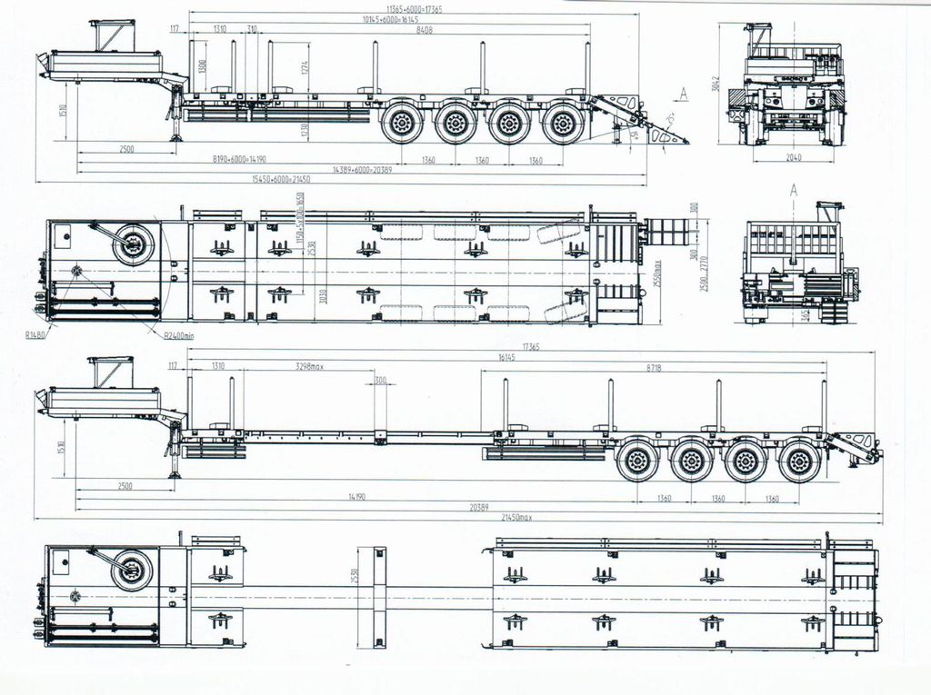 45300 в сдвинутом положении / 39200 кг в раздвинутом положении, шины 385/65R22,5/8+1, платформа 10145 (11365 до трапов) в сдвинутом положении/ 16145 (17365 до трапов) в раздвинутом положении x 2530, уширители до 3030 мм, съемные стойки, передний щит, ССУ 1510 мм, пневматическая подвеска 3+1
