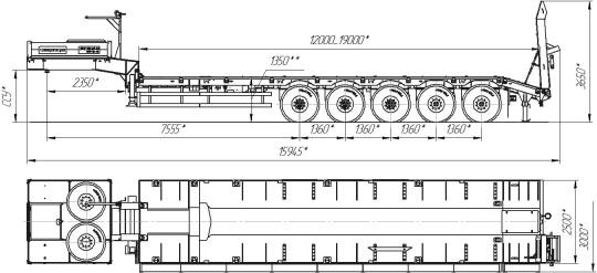 60000 в сдвинутом положении / 45000 кг в раздвинутом положении, шины 445/65R22,5/10+1, платформа 12000 до трапов в сдвинутом положении/ 19000 до трапов) в раздвинутом положении x 2500, уширители до 3000 мм, съемные стойки 1600 мм, ССУ 1510 мм, пневматическая подвеска 3+2